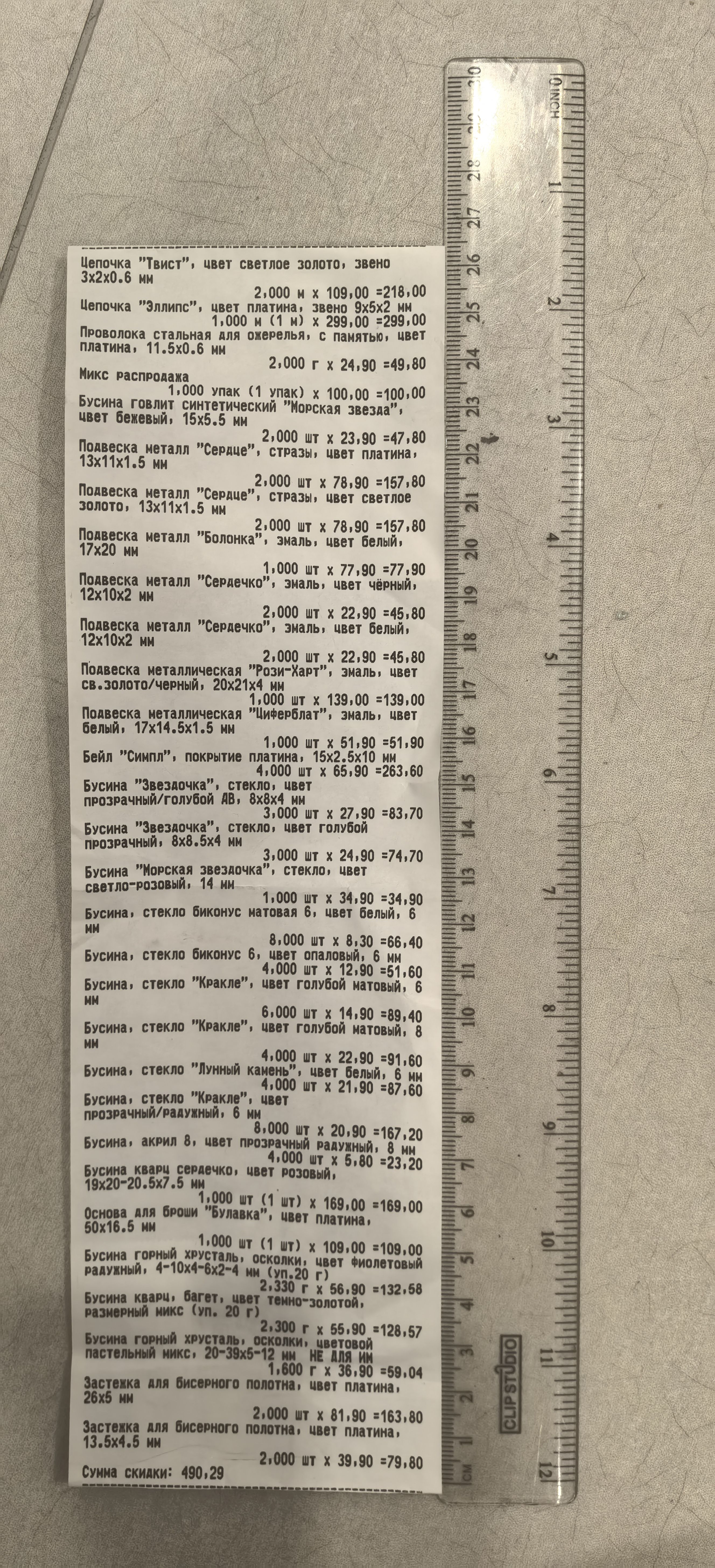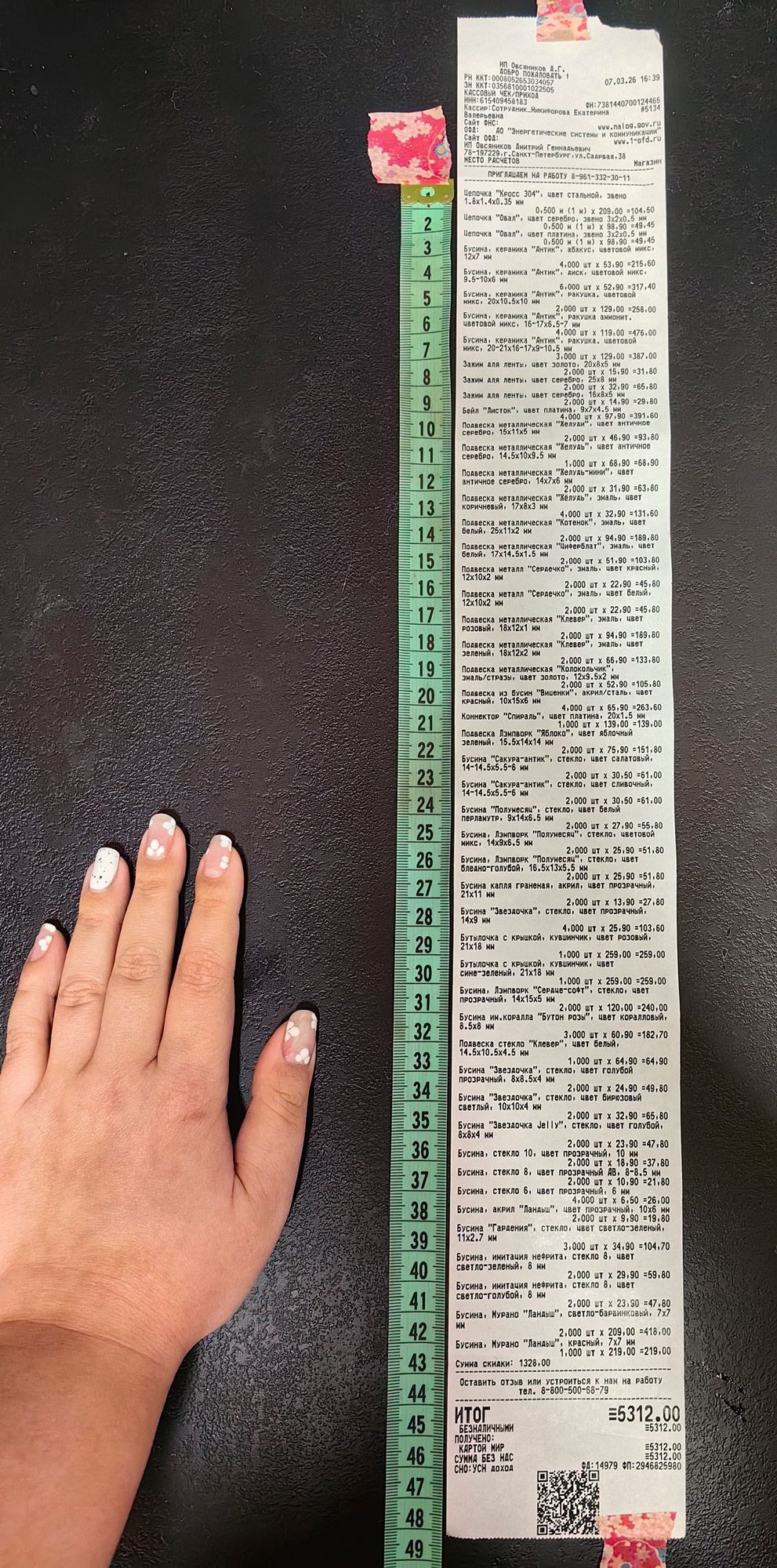 2. Измерьте длину вашего чека и сфотографируйте его рядом с линейкой или метром. Обратите внимание, что экваринговая часть чека (верхняя часть чека до обозначения ИП, печатается не всегда) и купон за покупку в конце чека не учитываются!