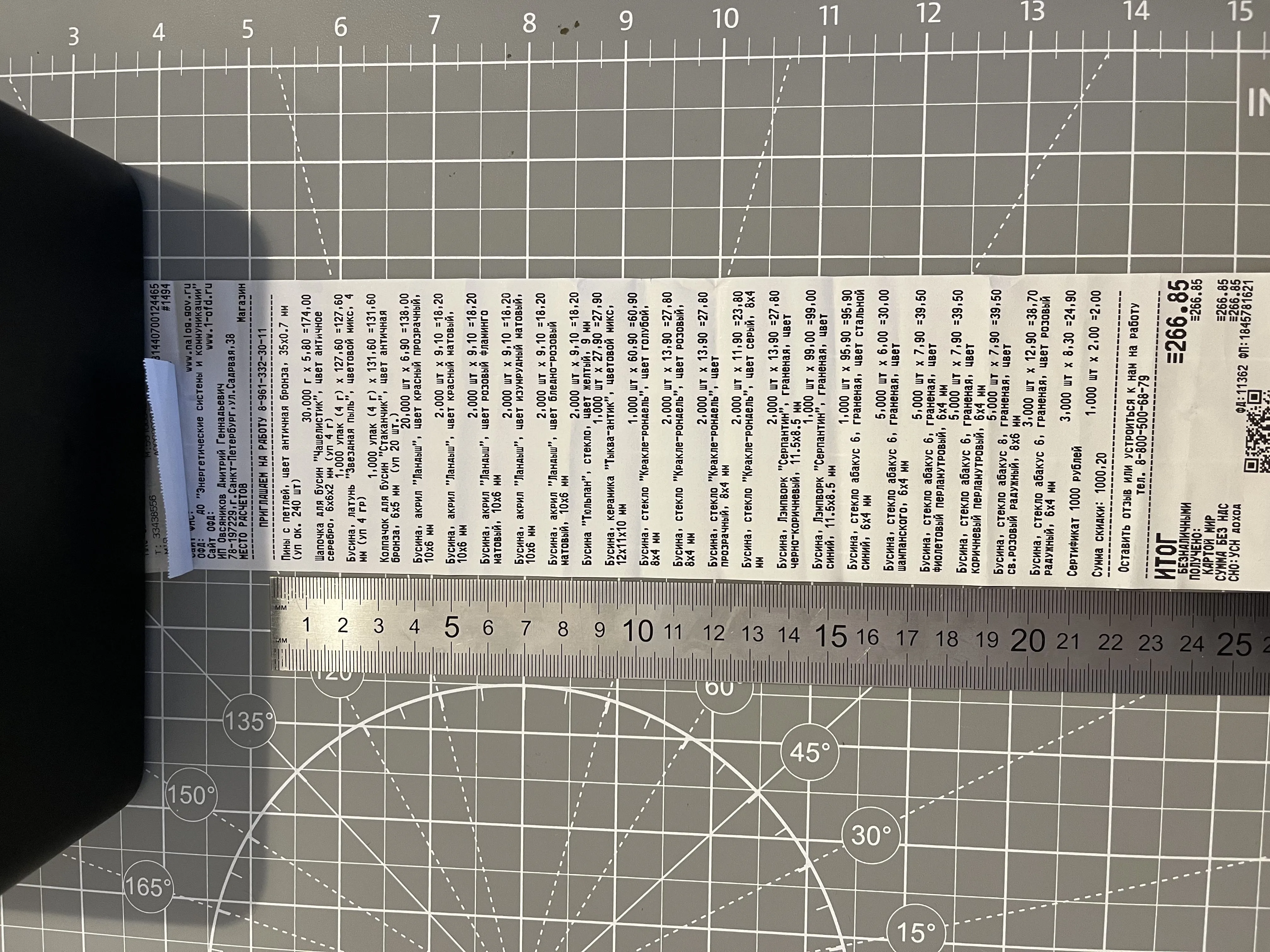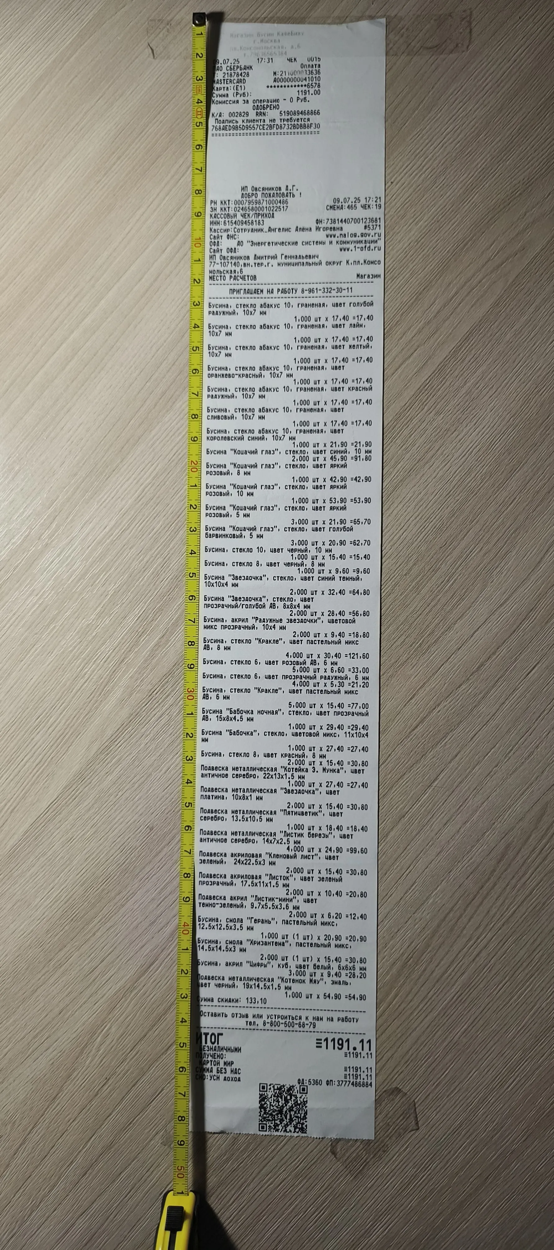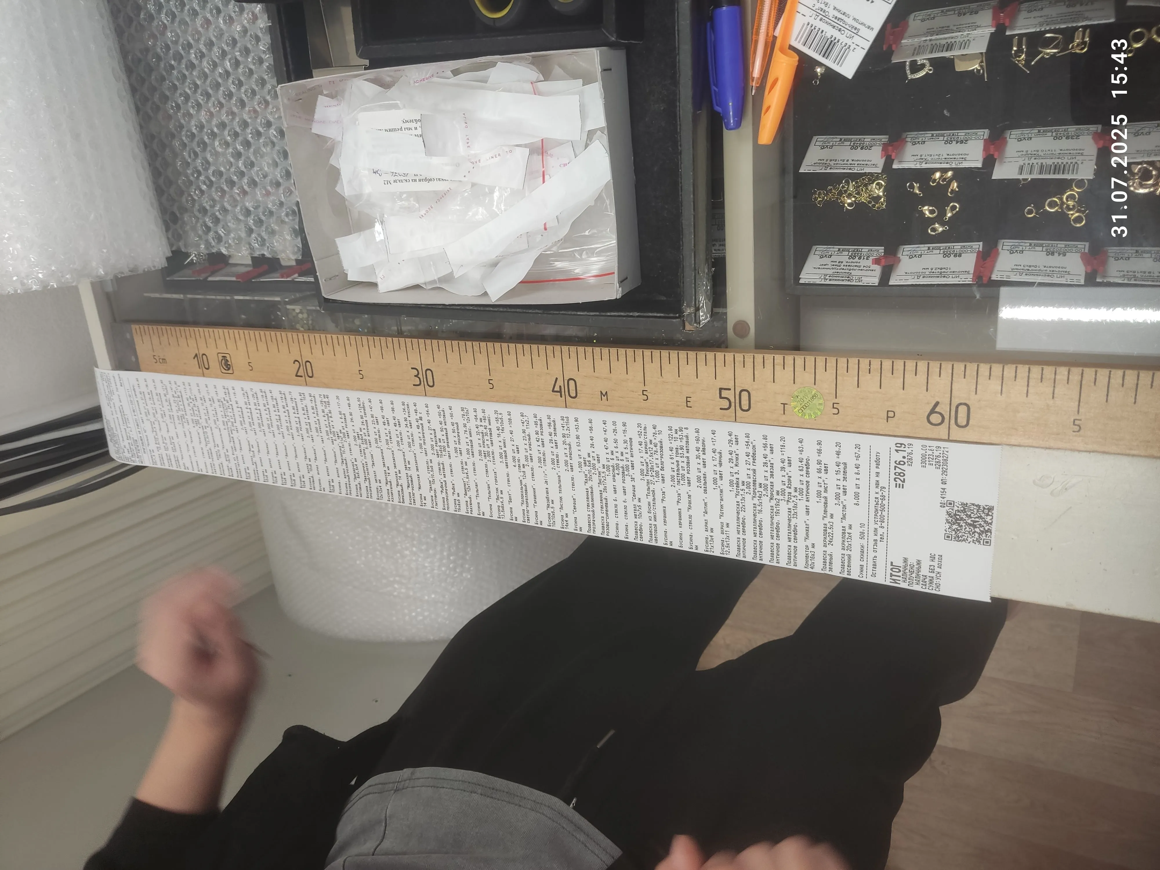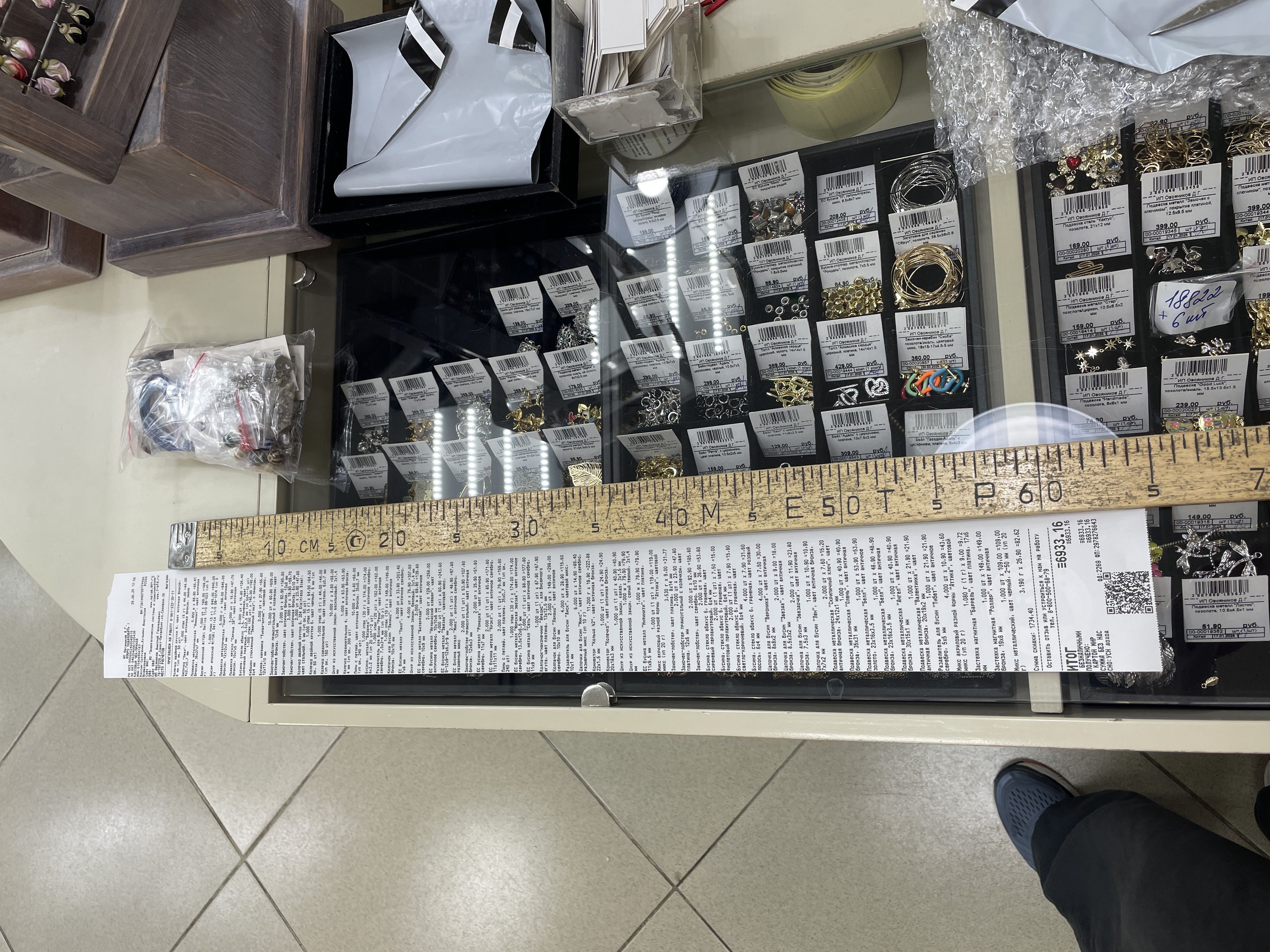 Доброе утро! Была почти месяц назад в красивом городе Москва 11 октября. Была приятно удивлена такому большущему выбору разных бусин и фурнитур! (я попала в сказку?) Наверное я опоздала, но вот мой чек на 1метр 11см и 9мм (покупка была в 12:24 в точке на улице Марксистская 3с1), а, и меня зовут Света (линейка на фоне 20см) https://vk.com/id810939739