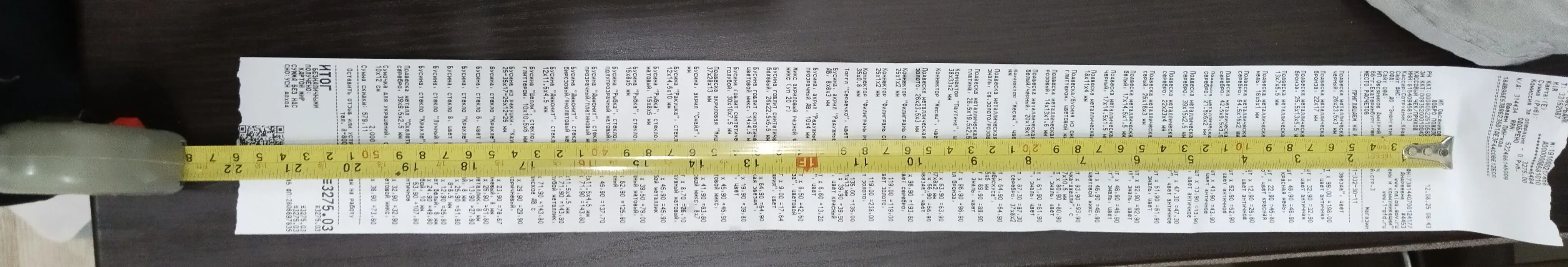 2. Измерьте длину вашего чека и сфотографируйте его рядом с линейкой или метром. Обратите внимание, что экваринговая часть чека (верхняя часть чека до обозначения ИП, печатается не всегда) и купон за покупку в конце чека не учитываются!