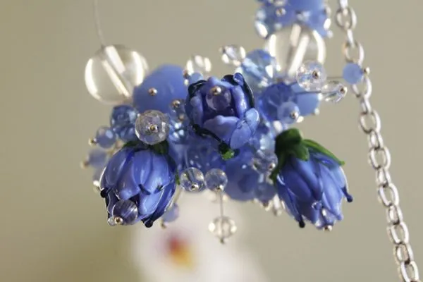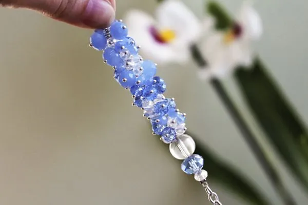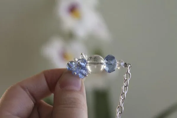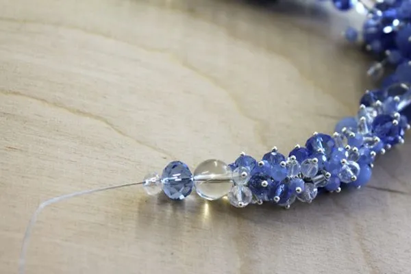 26. сначала нанизываем на тросик три бусины, одну прозрачную, абакус 6 мм, одну голубую, абакус 10 мм, одну прозрачную без огранки, 12 мм.