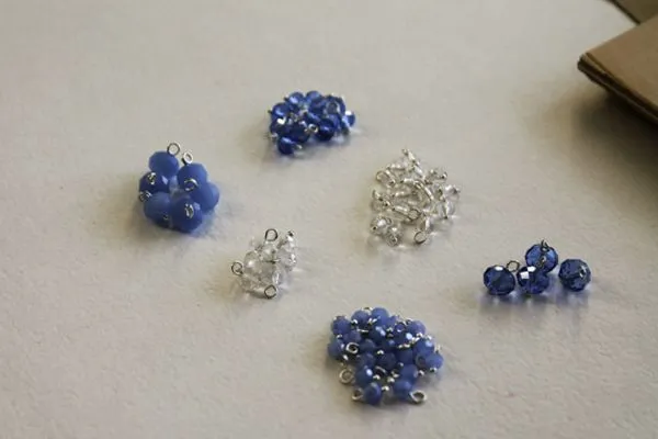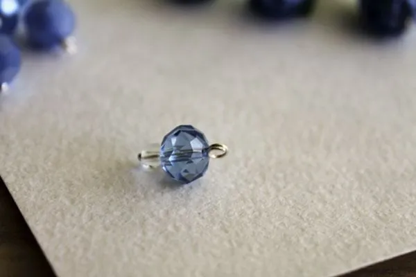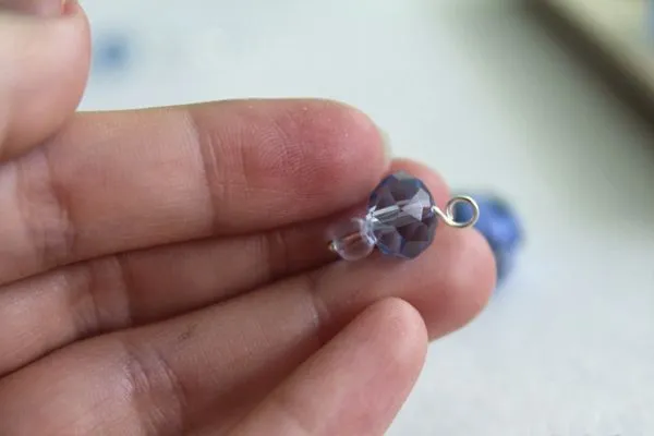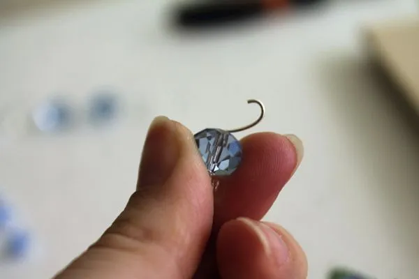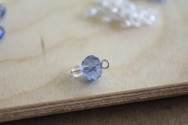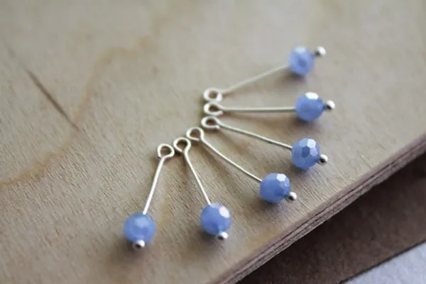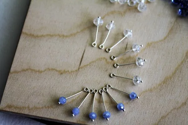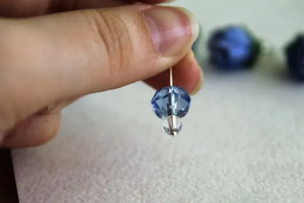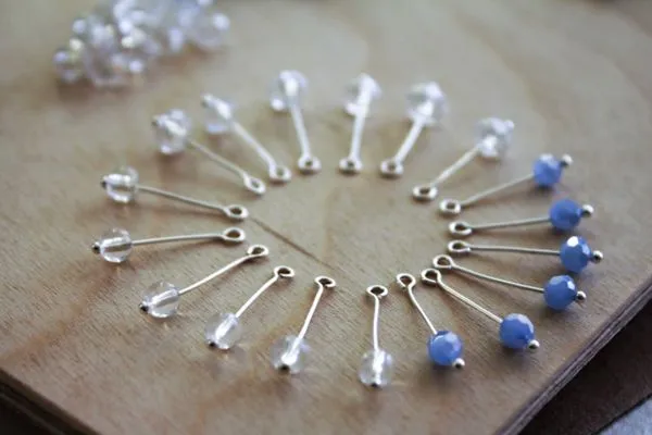 13. Нам нужно подготовить четыре одинаковые подвесочки. А именно, надеть на короткий пин одну прозрачную круглую бусину без огранки, 4 мм и одну голубую бусину, абакус, 10 мм.