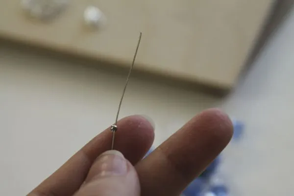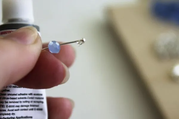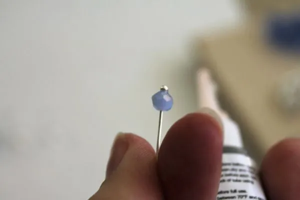 11. клей, наносим небольшое количество на кончик пина рядом с шариком. Ждем пару секунд и подвигаем бусинку к шарику пина.