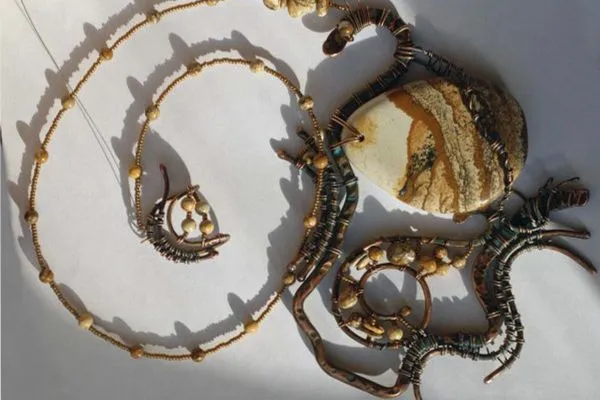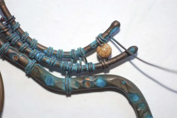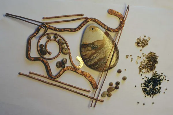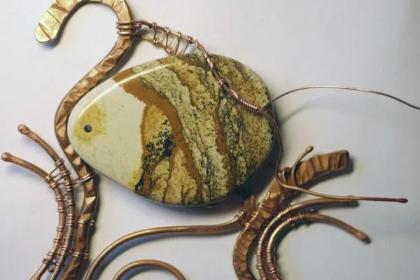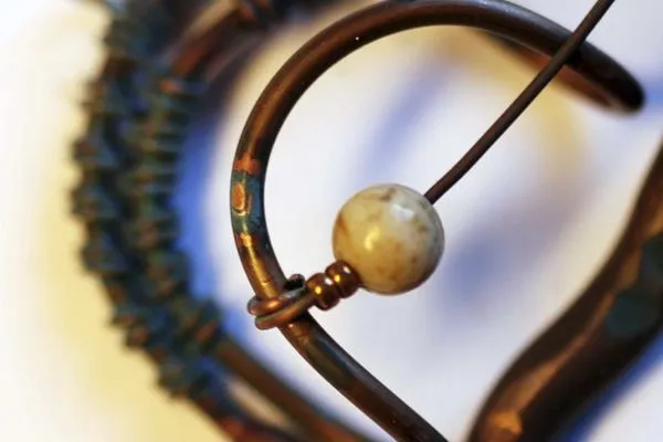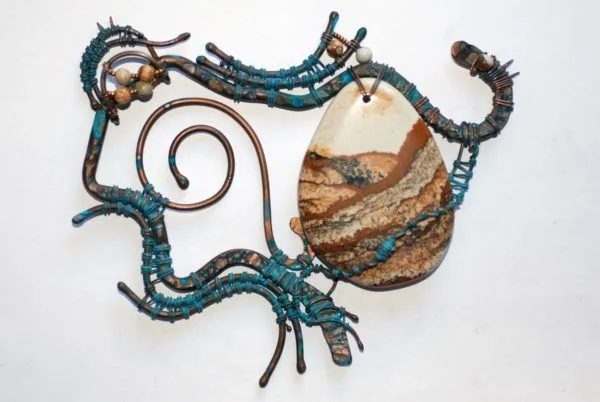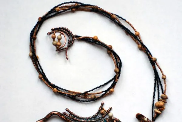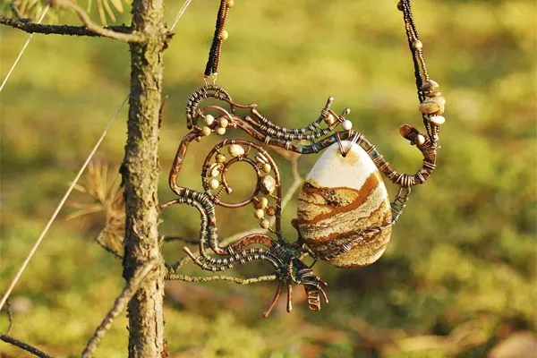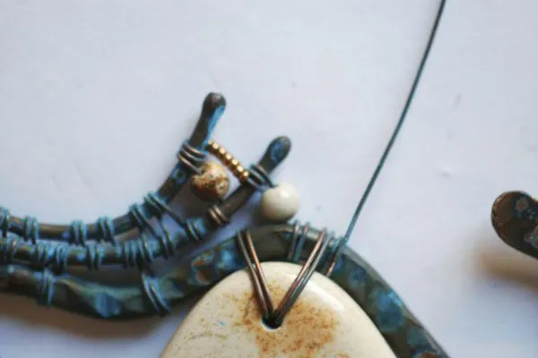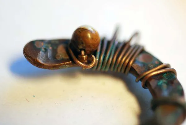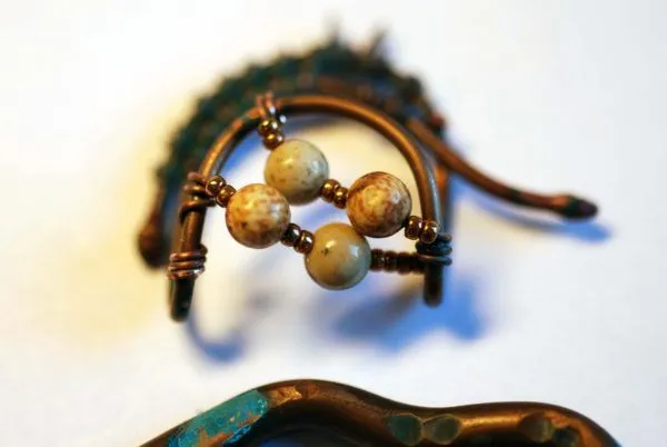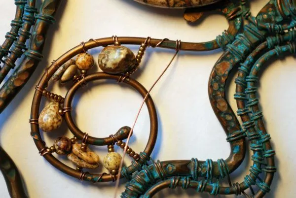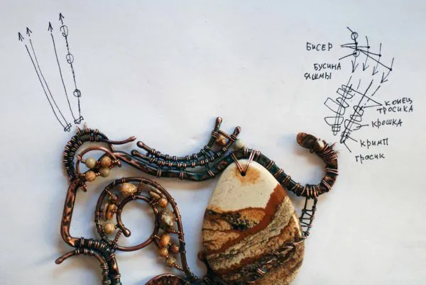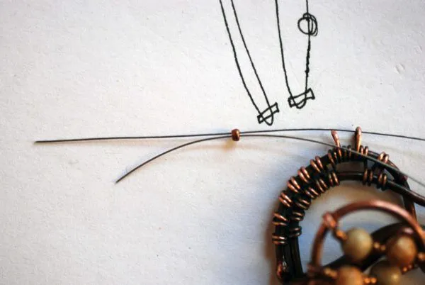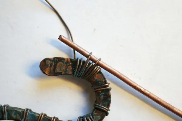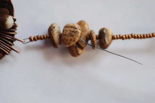 20. Прикрепляю яшмовую подвеску и начинаю оплетать каркас из медной трубочки