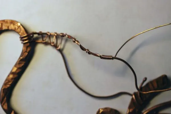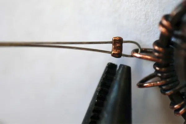 32. Изначально у меня была проволока длиной всего 23 см, и она закончилась на середине завитка. Закрепляю и прячу кончик при помощи кусачек и пинцета.