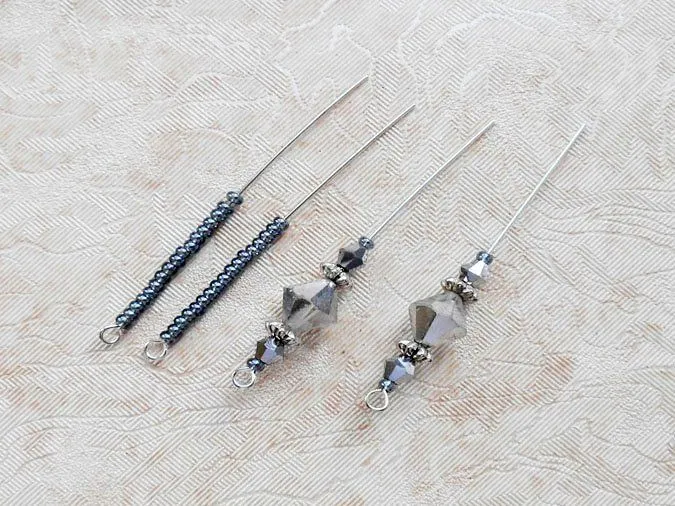 Привет! Я птичка Таня, и сегодня хочу показать еще один вид сережек, выполненных в похожей технике. Длинные серьги с цепочкой и сверкающими биконусами.
