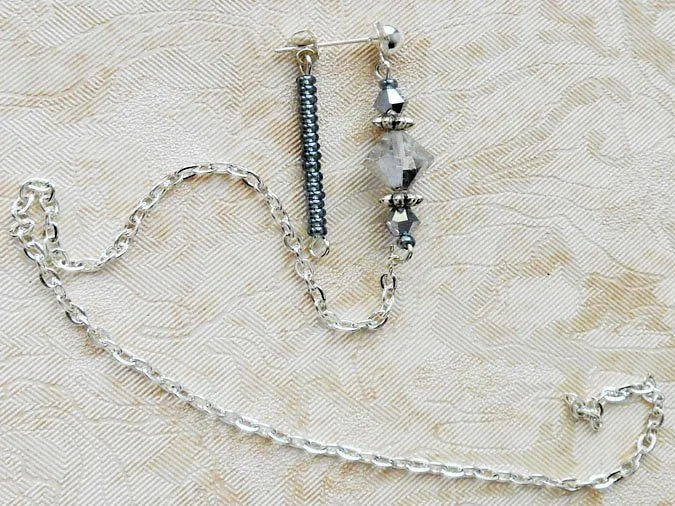 7. Обратите внимание: звенья на переднем и заднем плане соединены цепочками разной длины. Таким же образом делаем вторую серёжку.