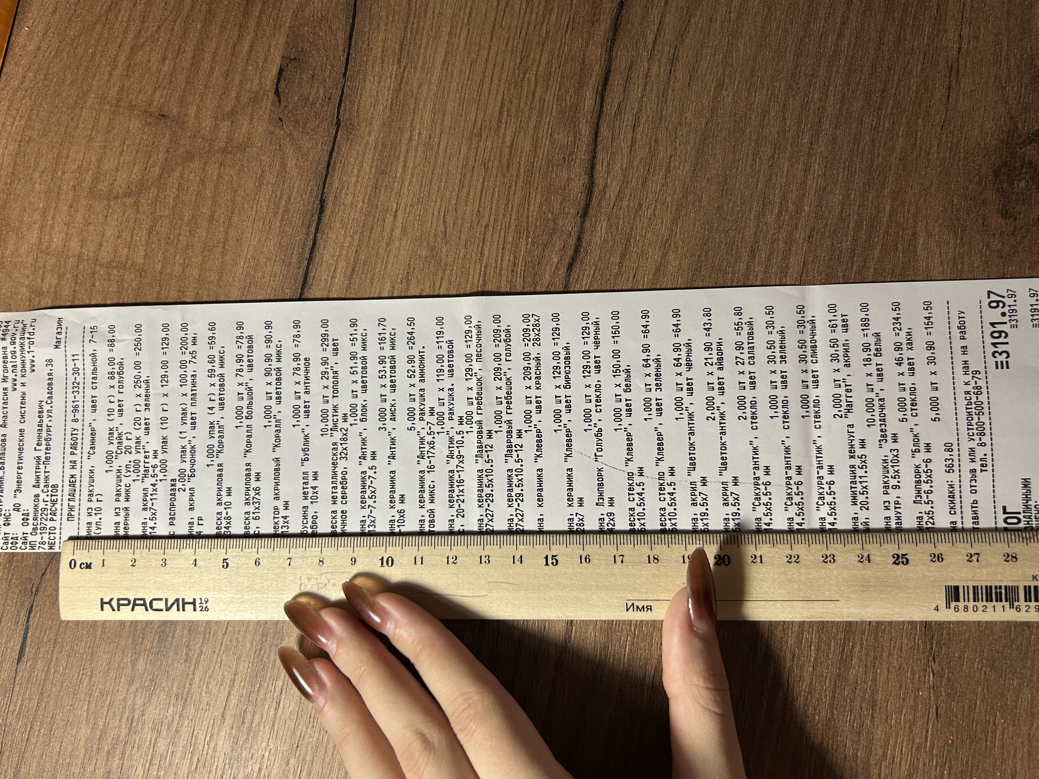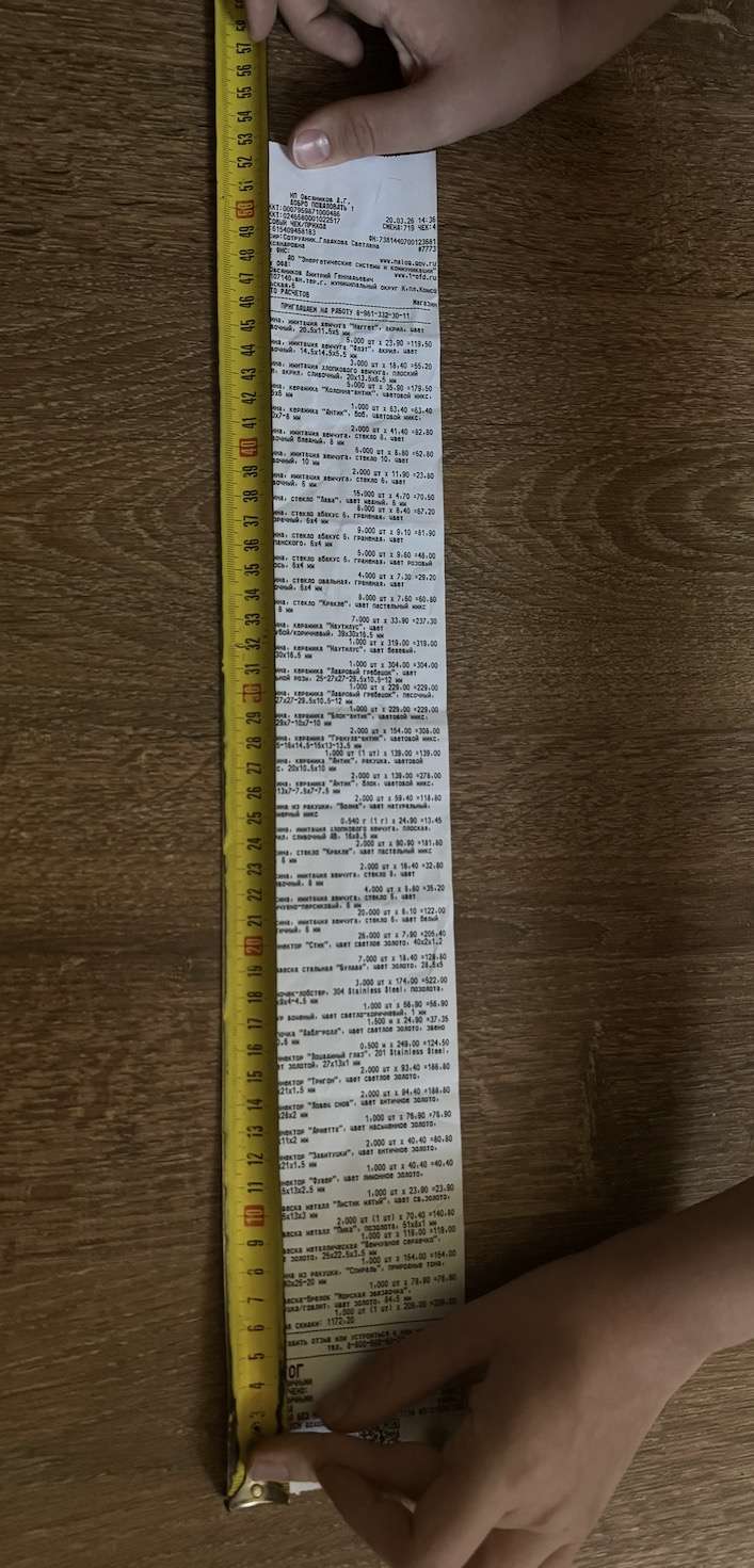 2. Измерьте длину вашего чека и сфотографируйте его рядом с линейкой или метром. Обратите внимание, что экваринговая часть чека (верхняя часть чека до обозначения ИП, печатается не всегда) и купон за покупку в конце чека не учитываются!