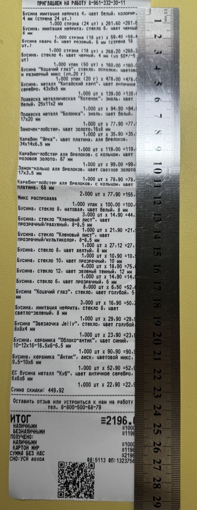 Магазин бусин Кафебижу, Марксистская ул., 3, стр. 1 (БЦ Планета, этаж 4), покупка от 22.01.26, длина чека – 35,1 см, ссылка на страницу: https://vk.com/kssushec