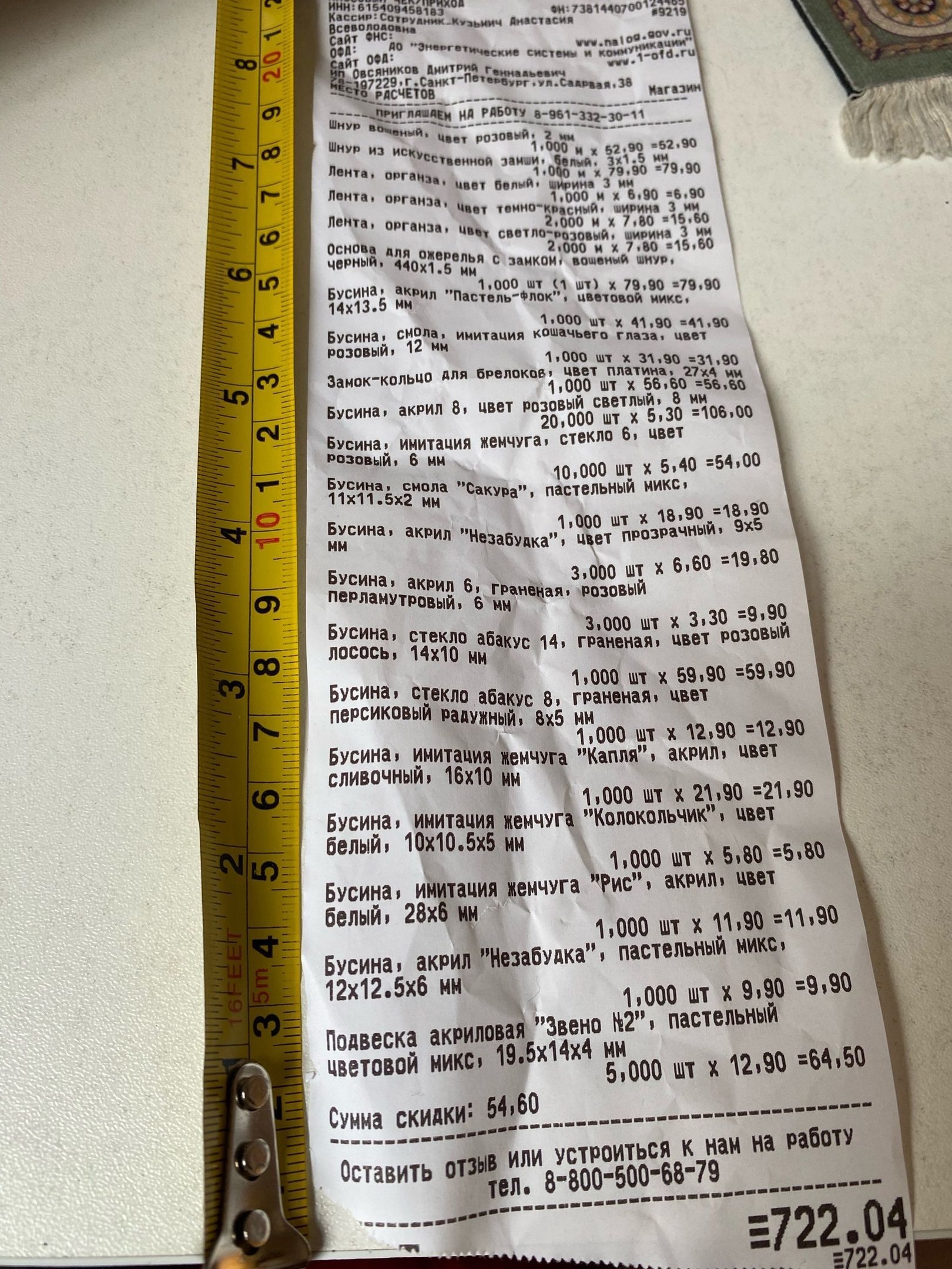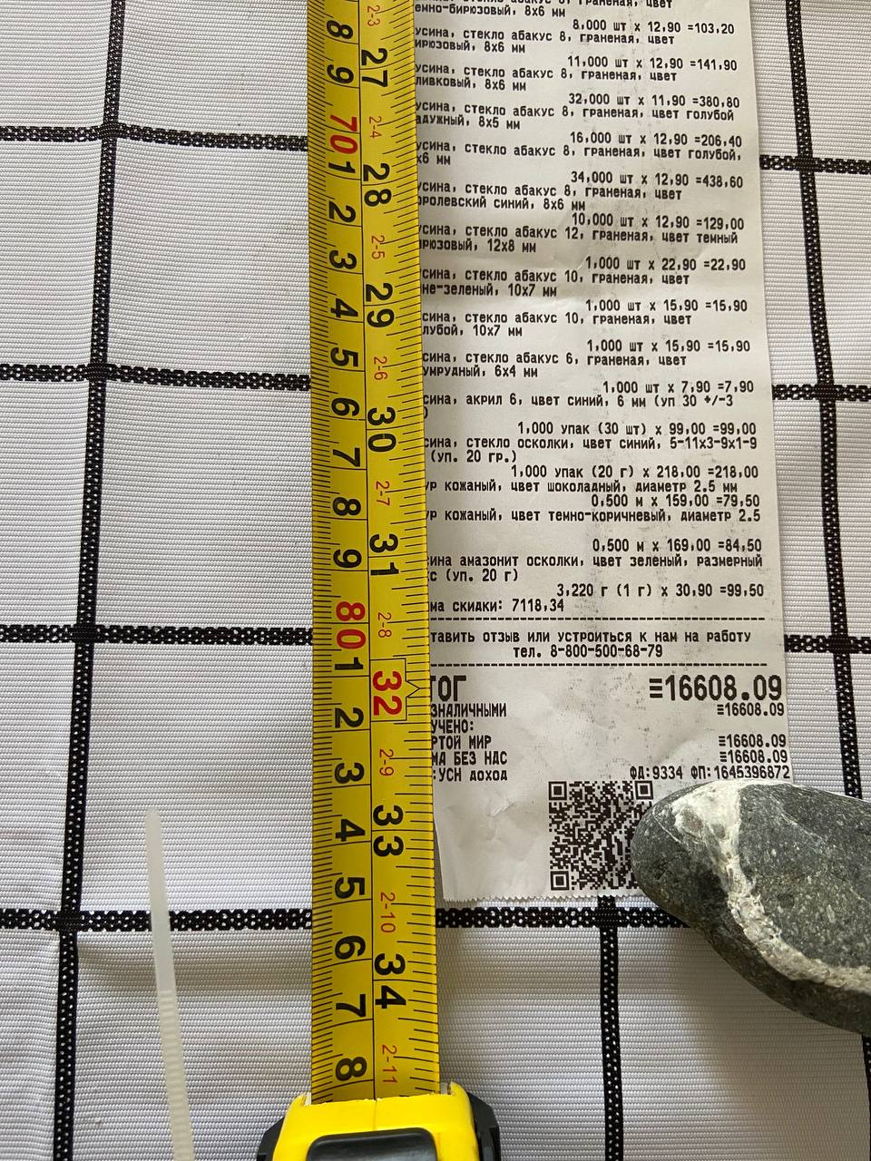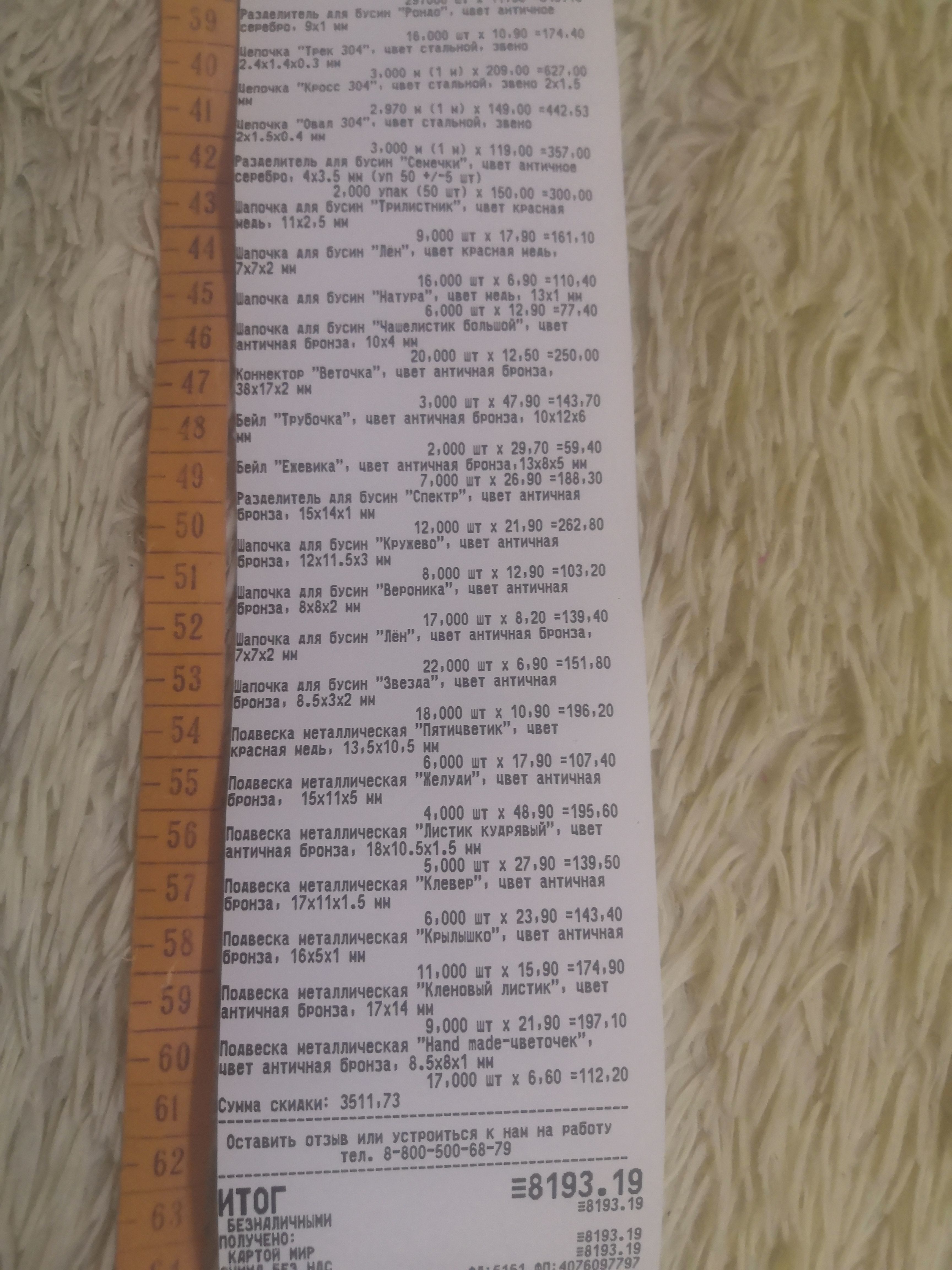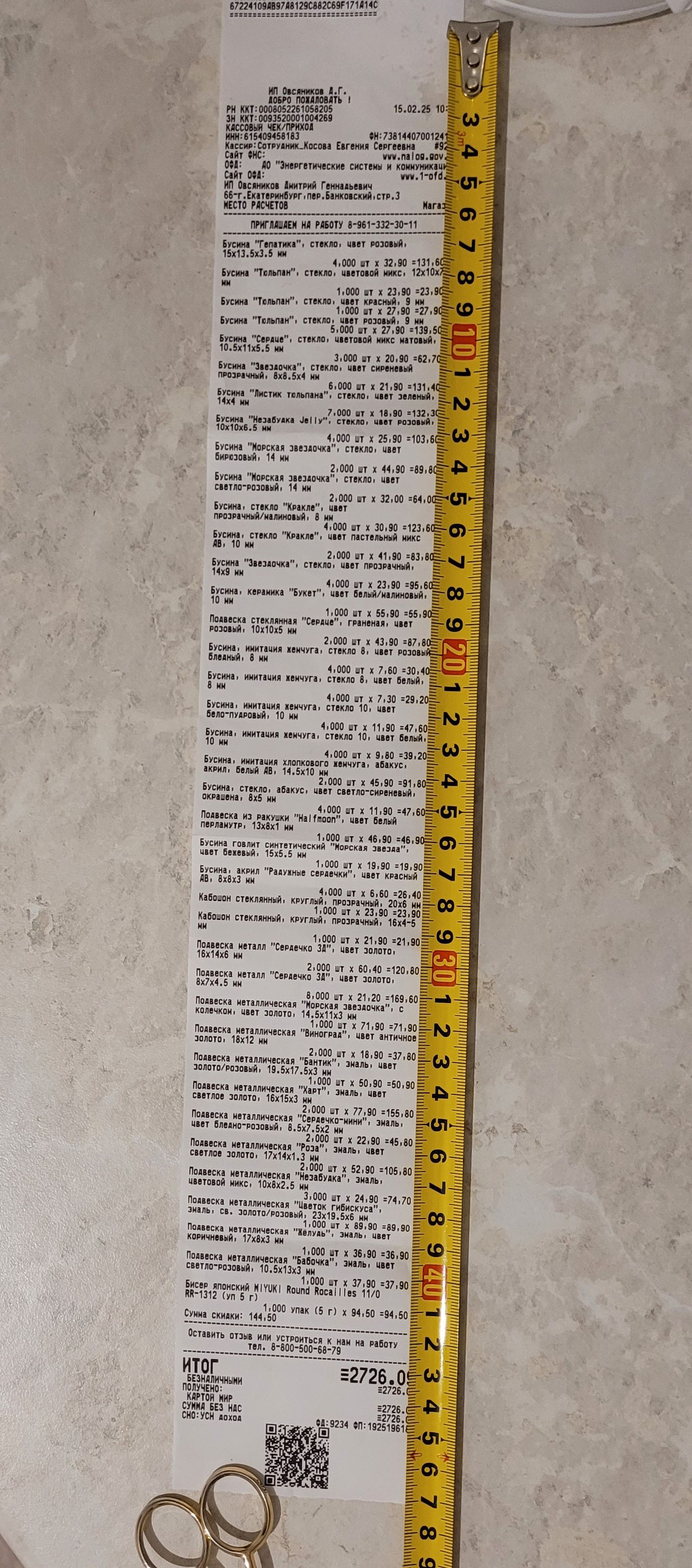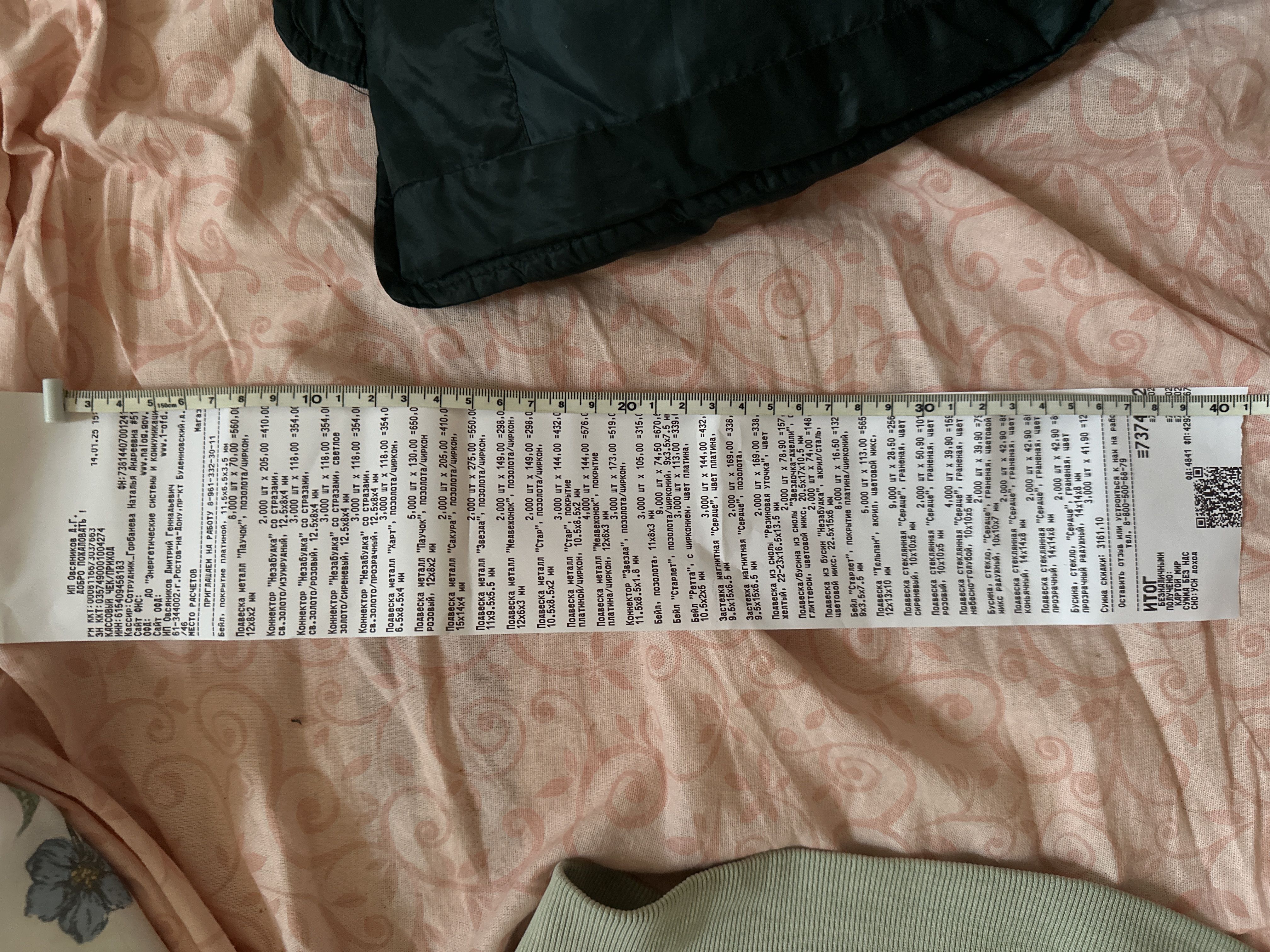 2. Измерьте длину вашего чека и сфотографируйте его рядом с линейкой или метром. Обратите внимание, что экваринговая часть чека (верхняя часть чека до обозначения ИП, печатается не всегда) и купон за покупку в конце чека не учитываются!