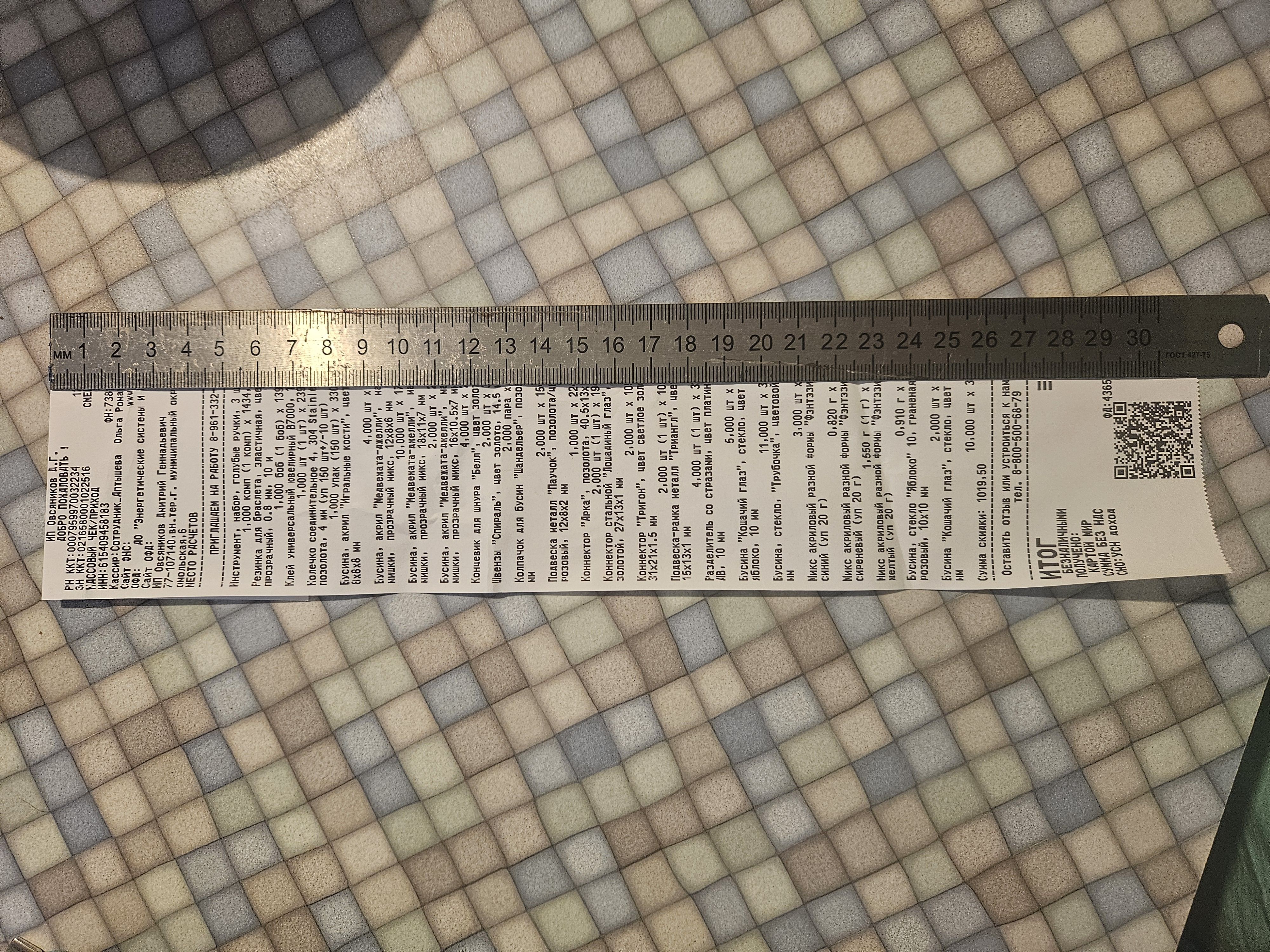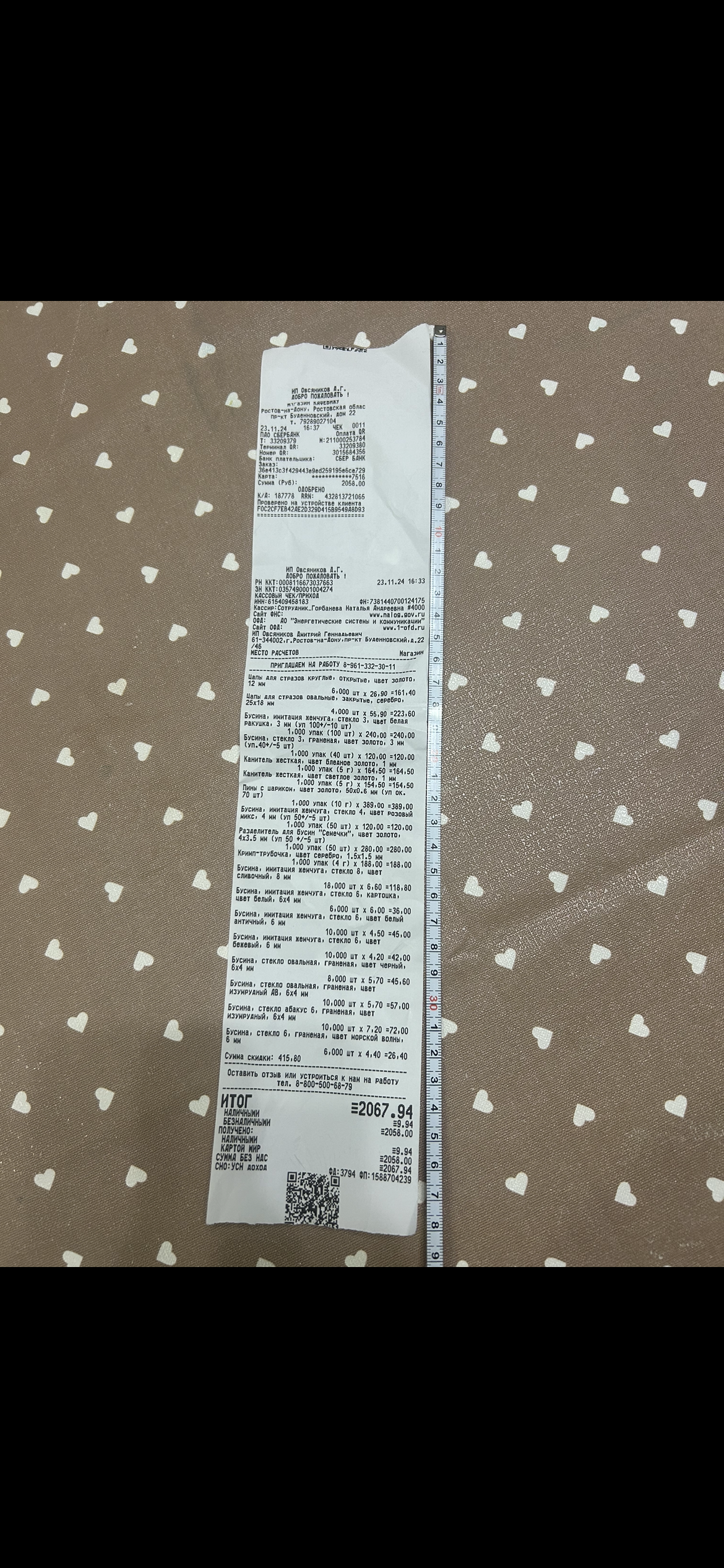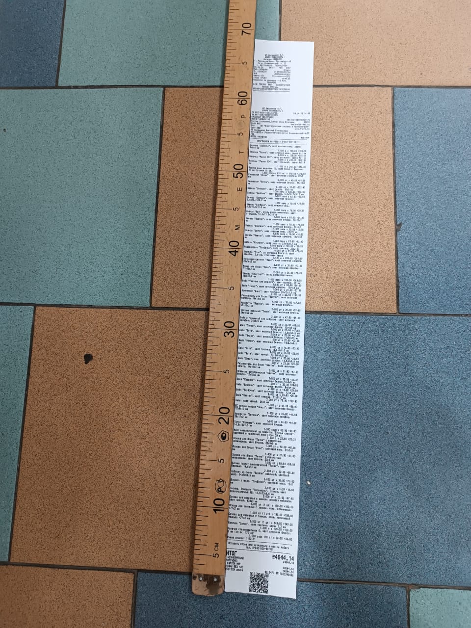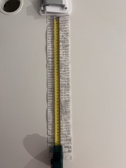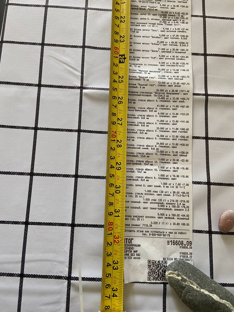 2. Измерьте длину вашего чека и сфотографируйте его рядом с линейкой или метром. Обратите внимание, что экваринговая часть чека (верхняя часть чека до обозначения ИП, печатается не всегда) и купон за покупку в конце чека не учитываются!