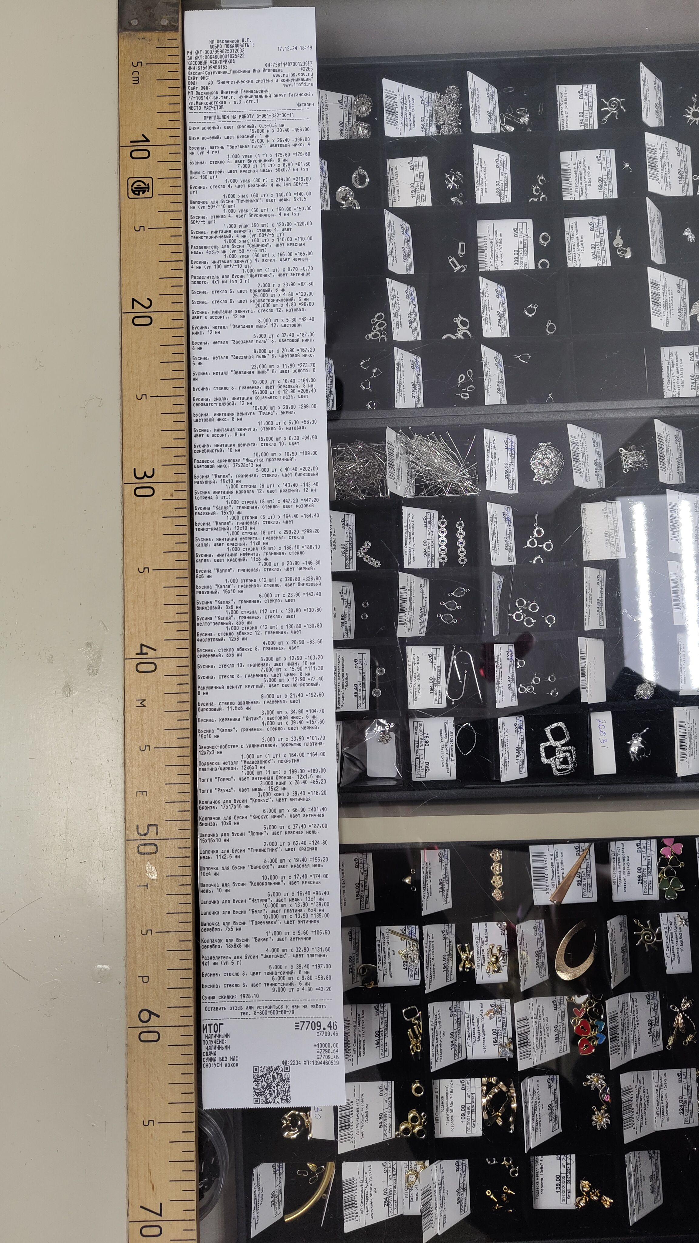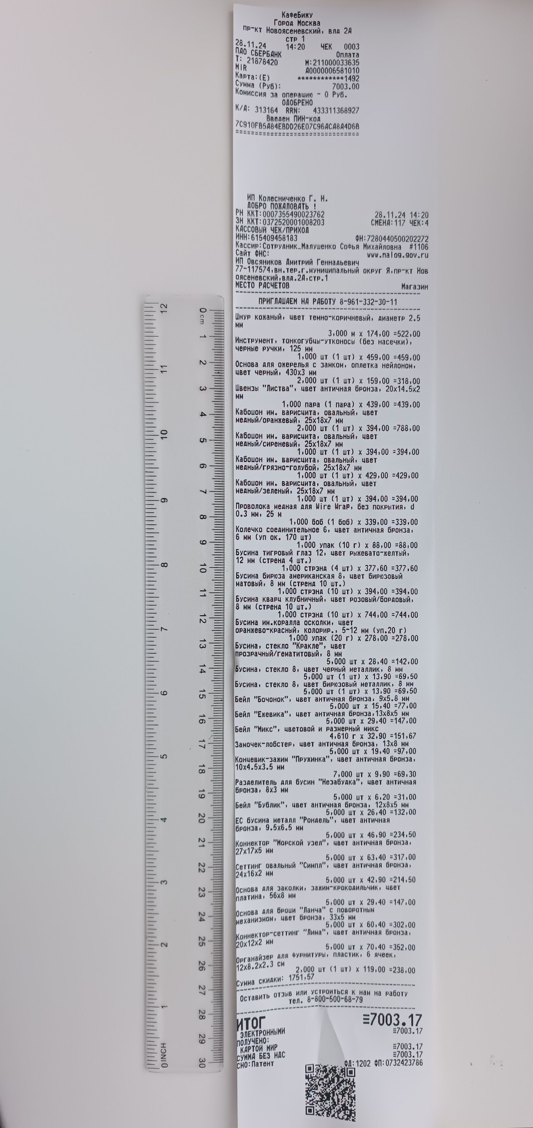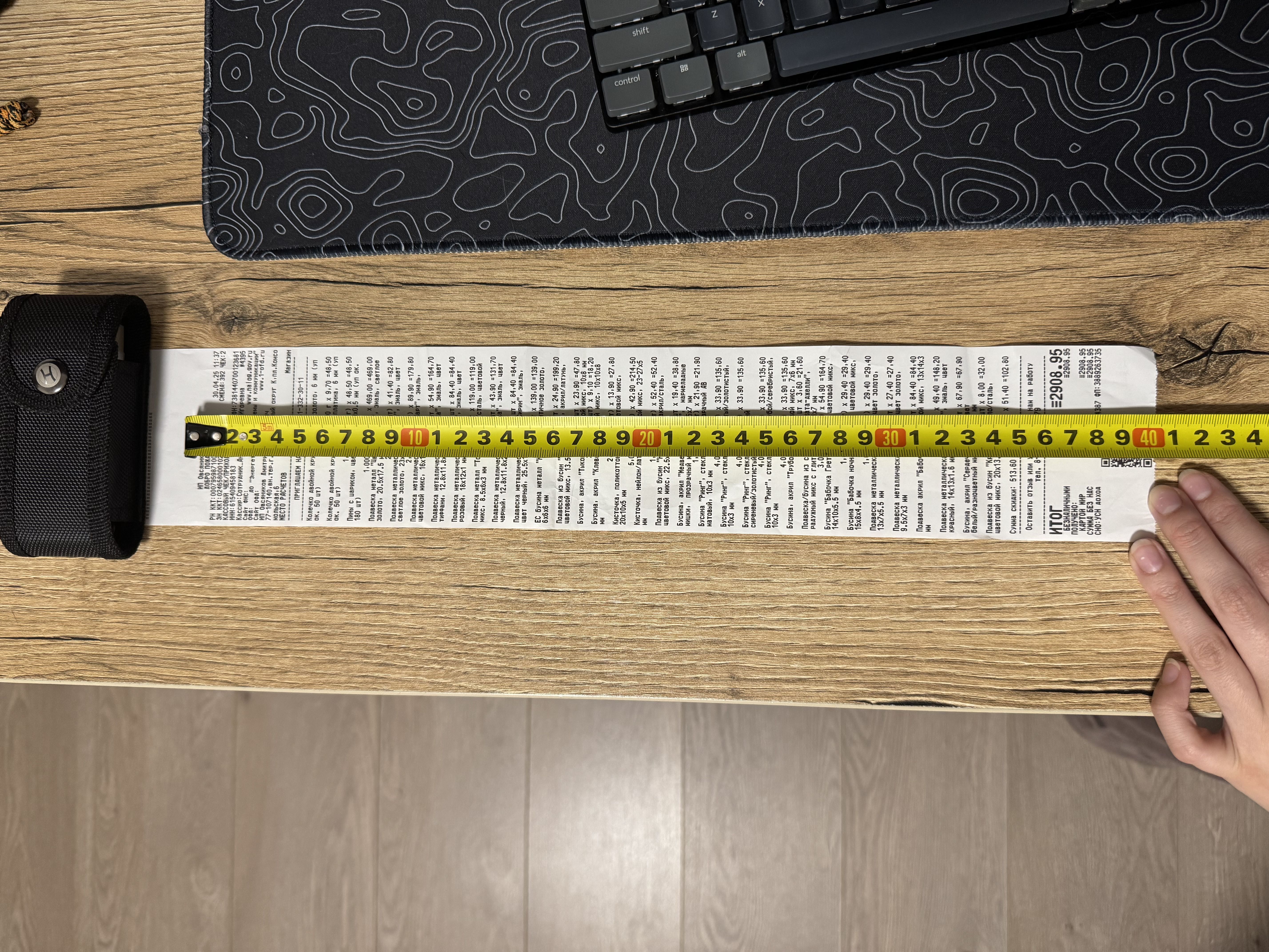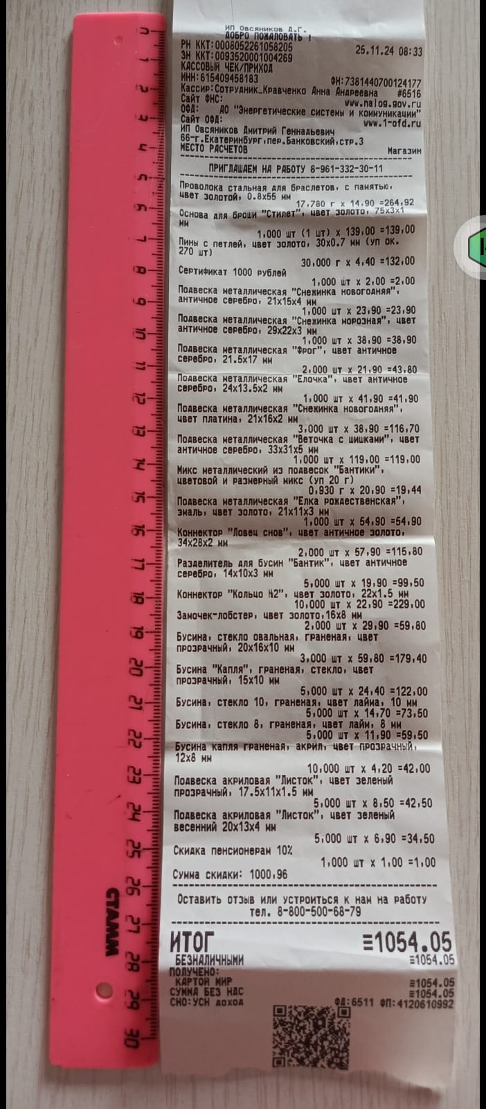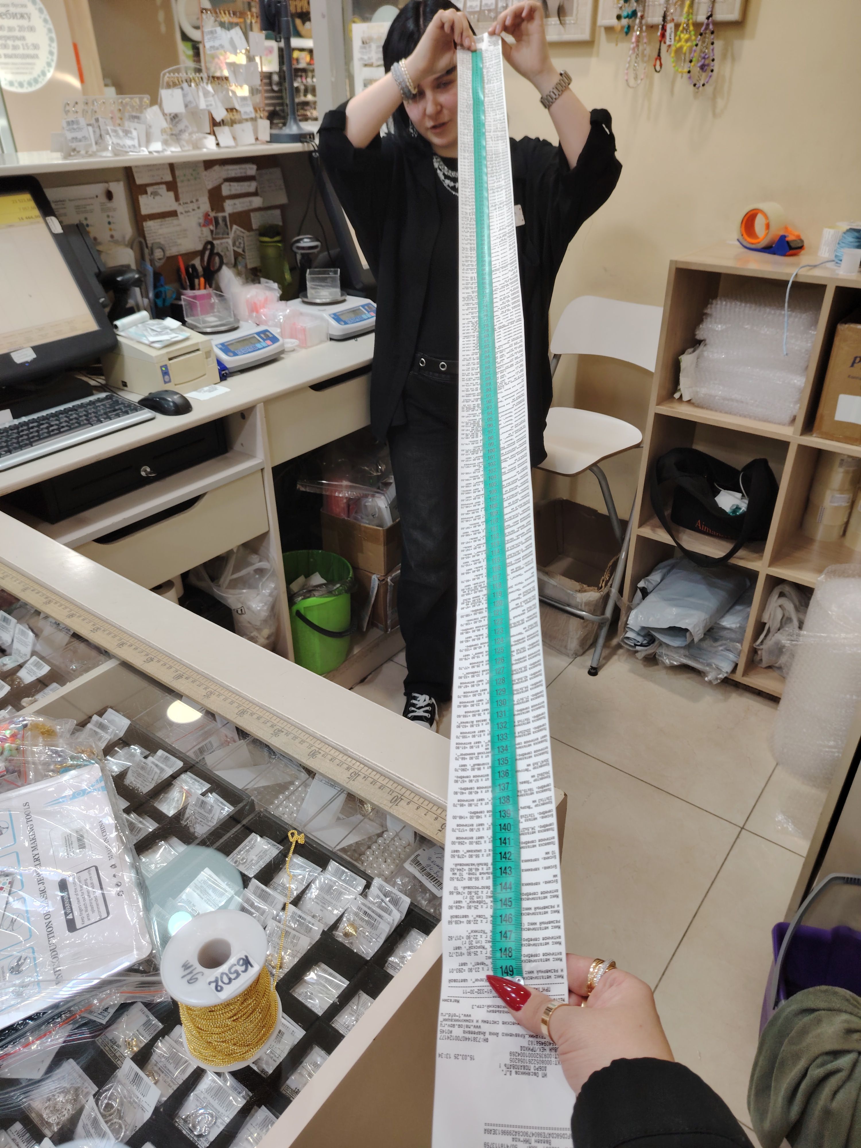 2. Измерьте длину вашего чека и сфотографируйте его рядом с линейкой или метром. Обратите внимание, что экваринговая часть чека (верхняя часть чека до обозначения ИП, печатается не всегда) и купон за покупку в конце чека не учитываются!