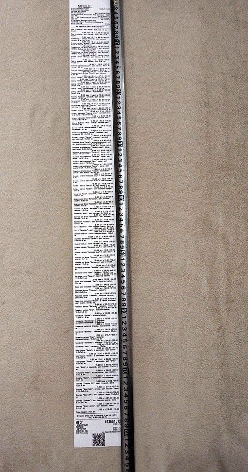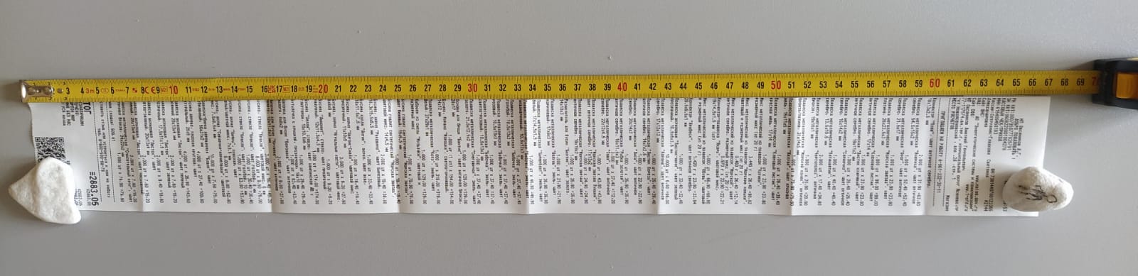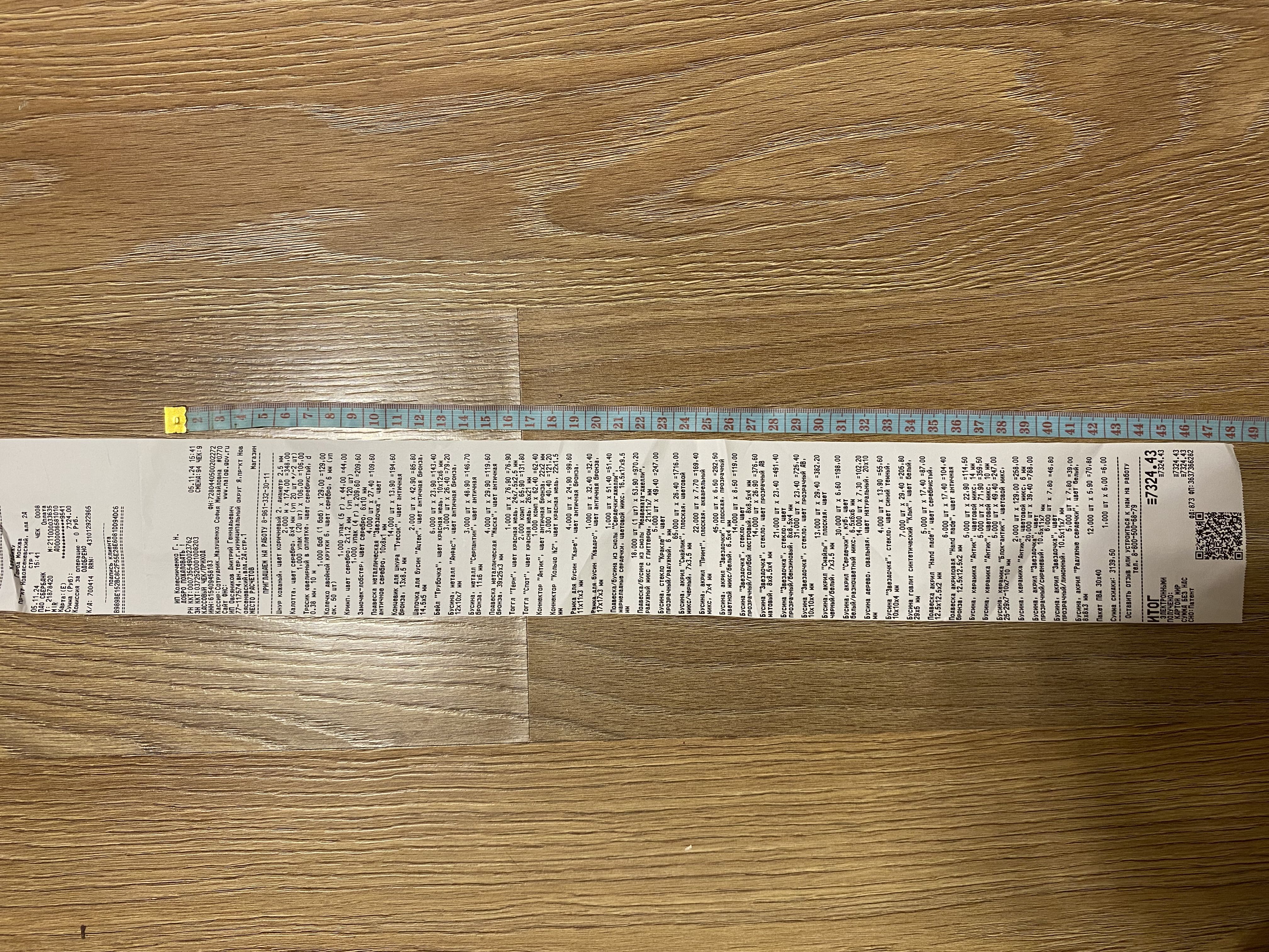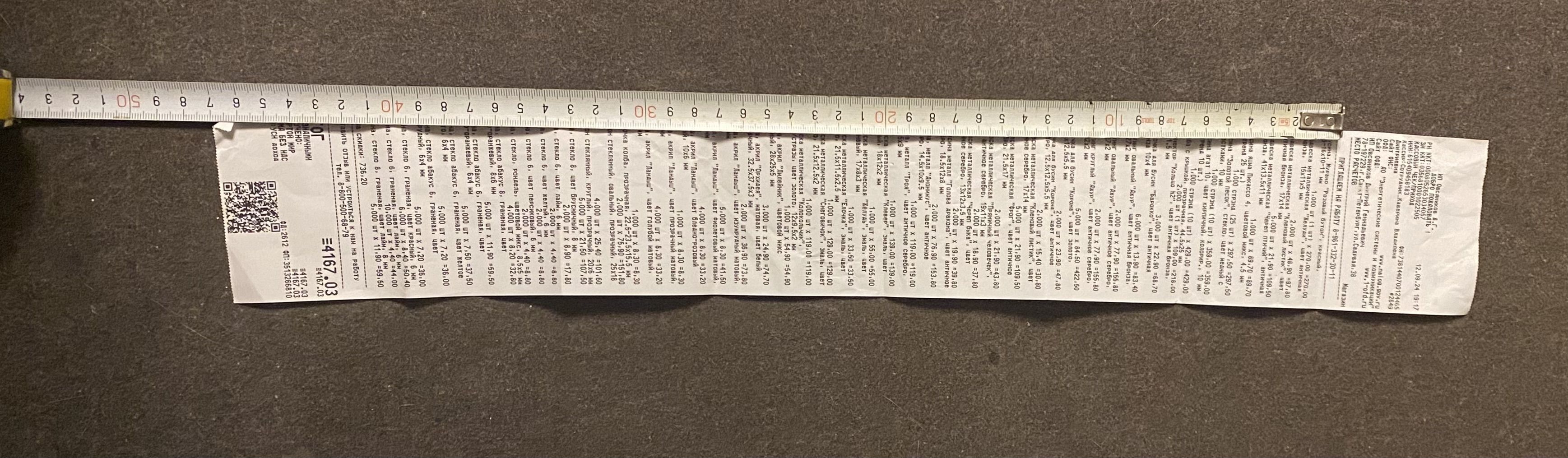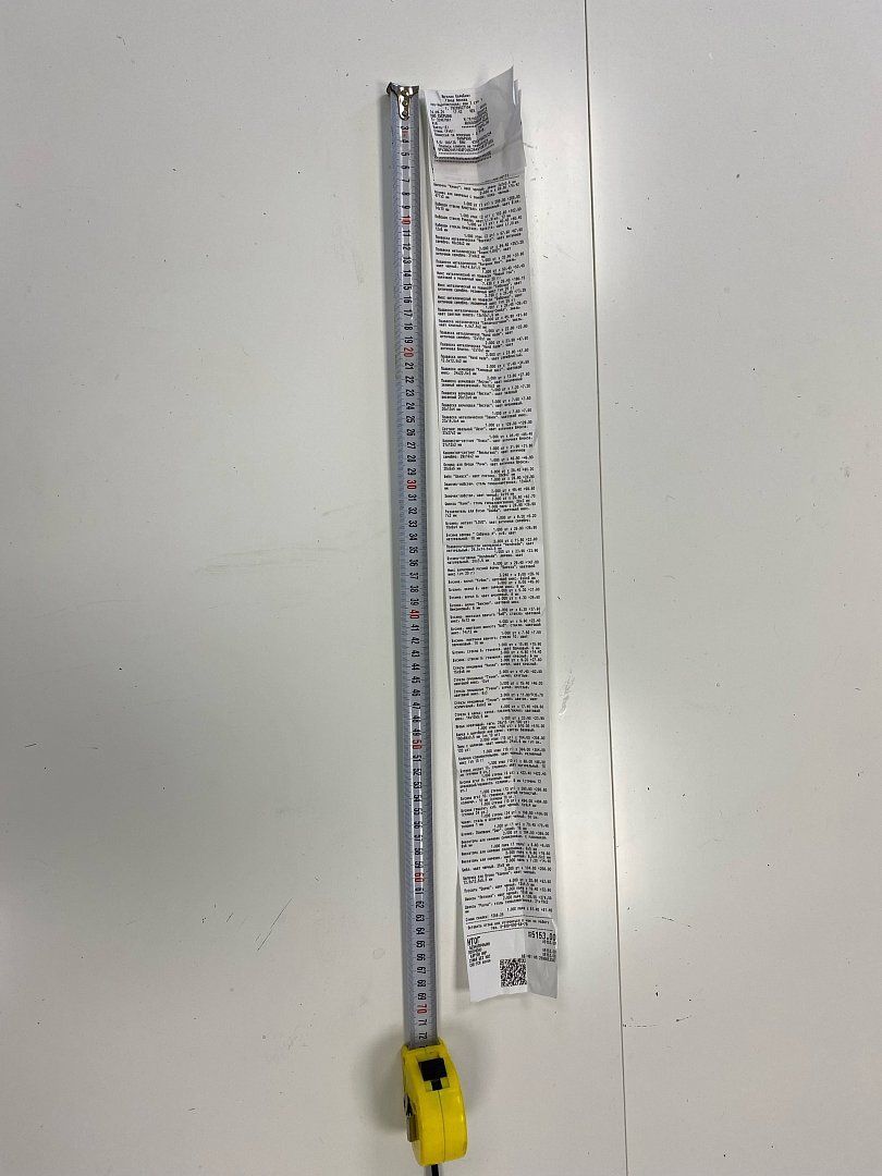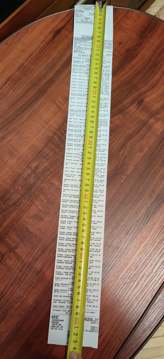 2. Измерьте длину вашего чека и сфотографируйте его рядом с линейкой или метром. Обратите внимание, что экваринговая часть чека (верхняя часть чека до обозначения ИП, печатается не всегда) и купон за покупку в конце чека не учитываются!