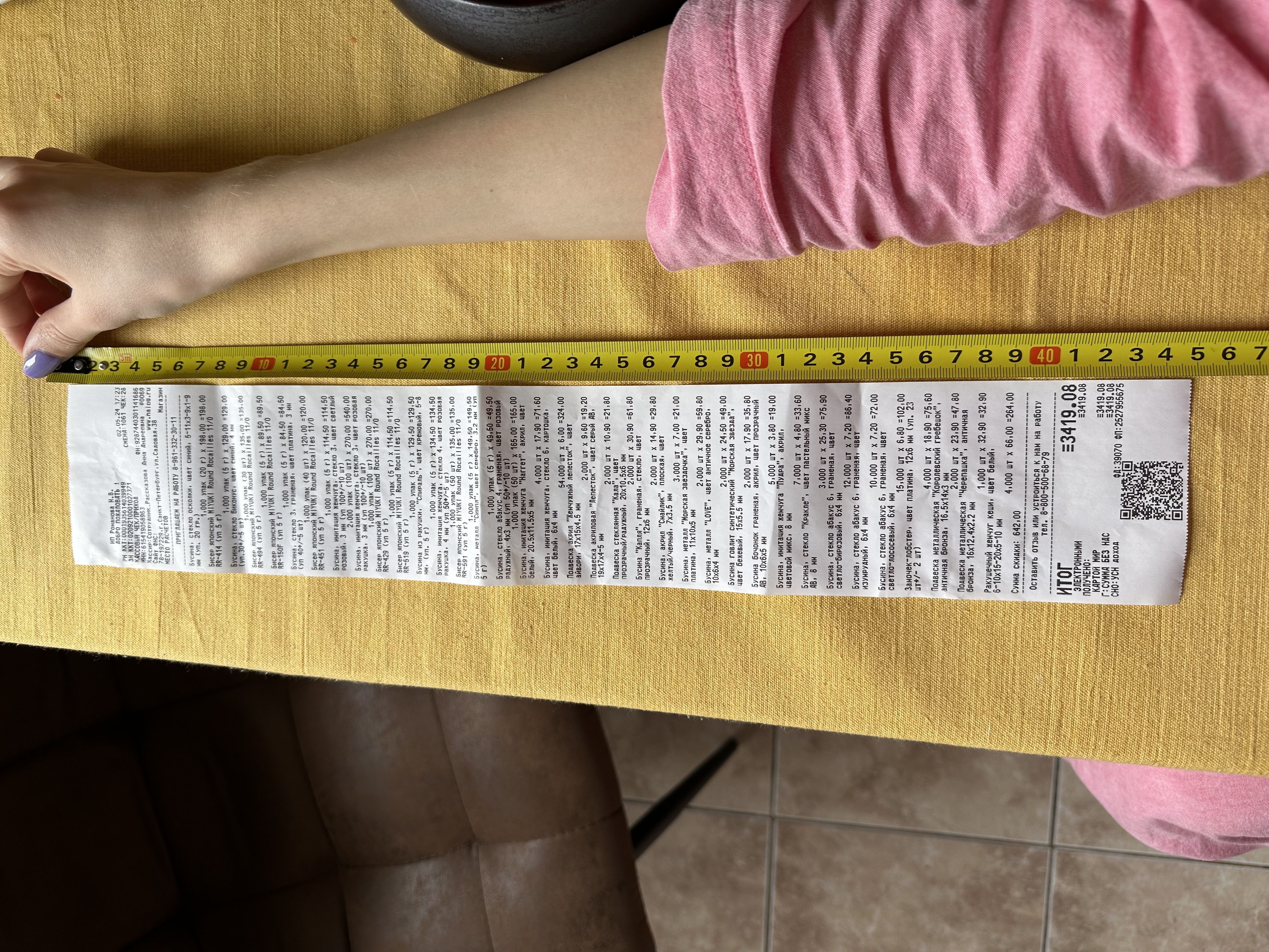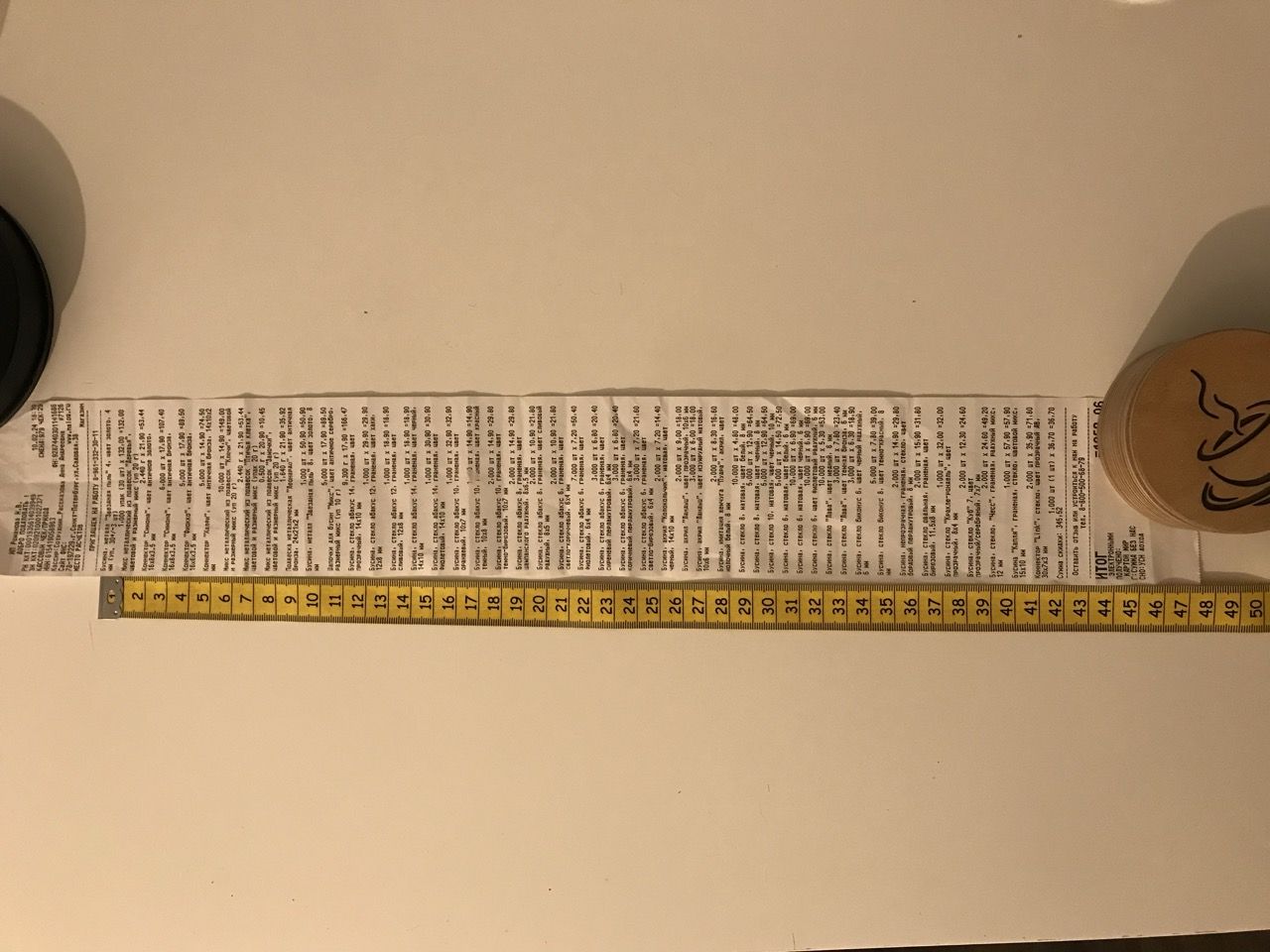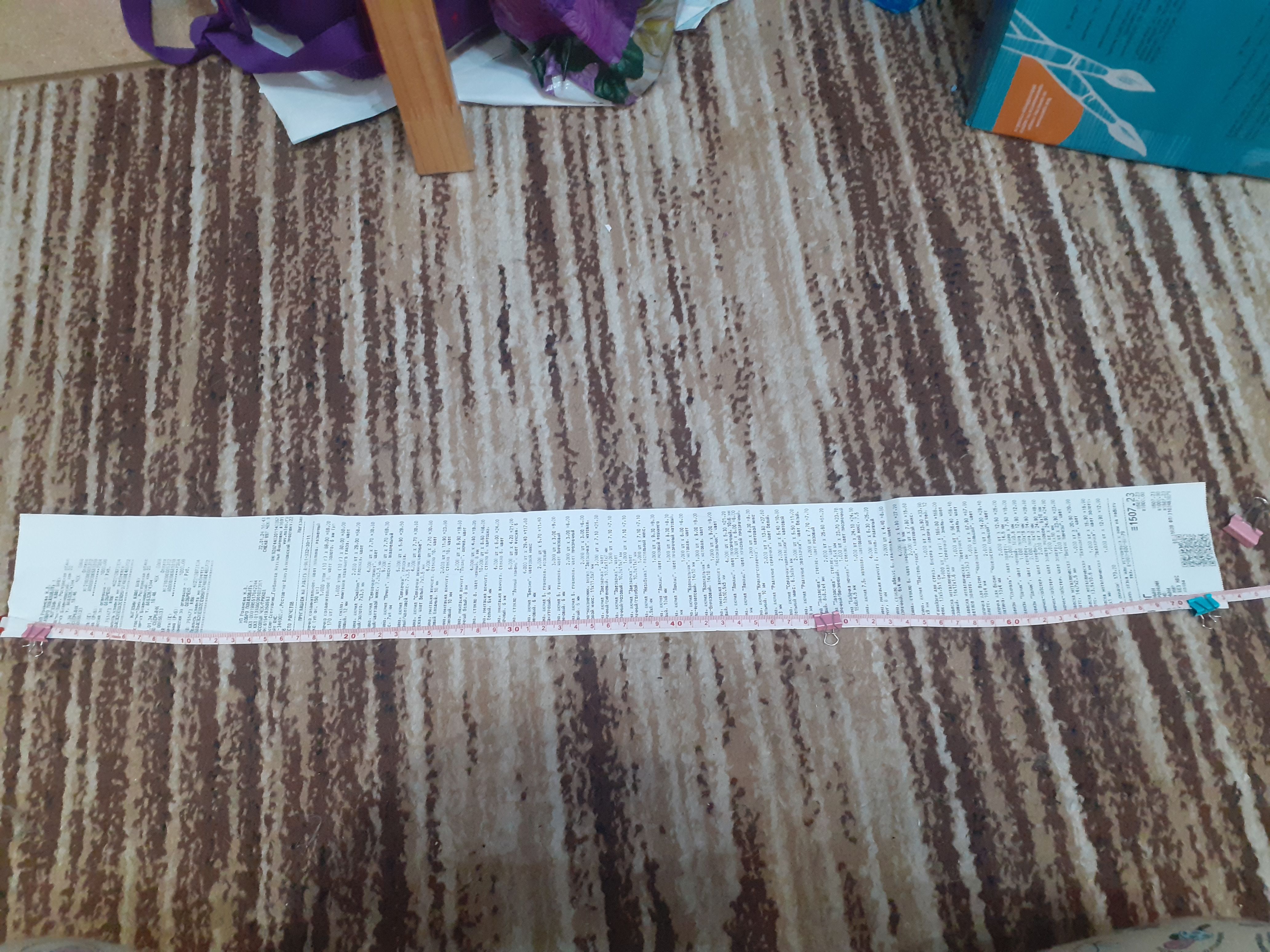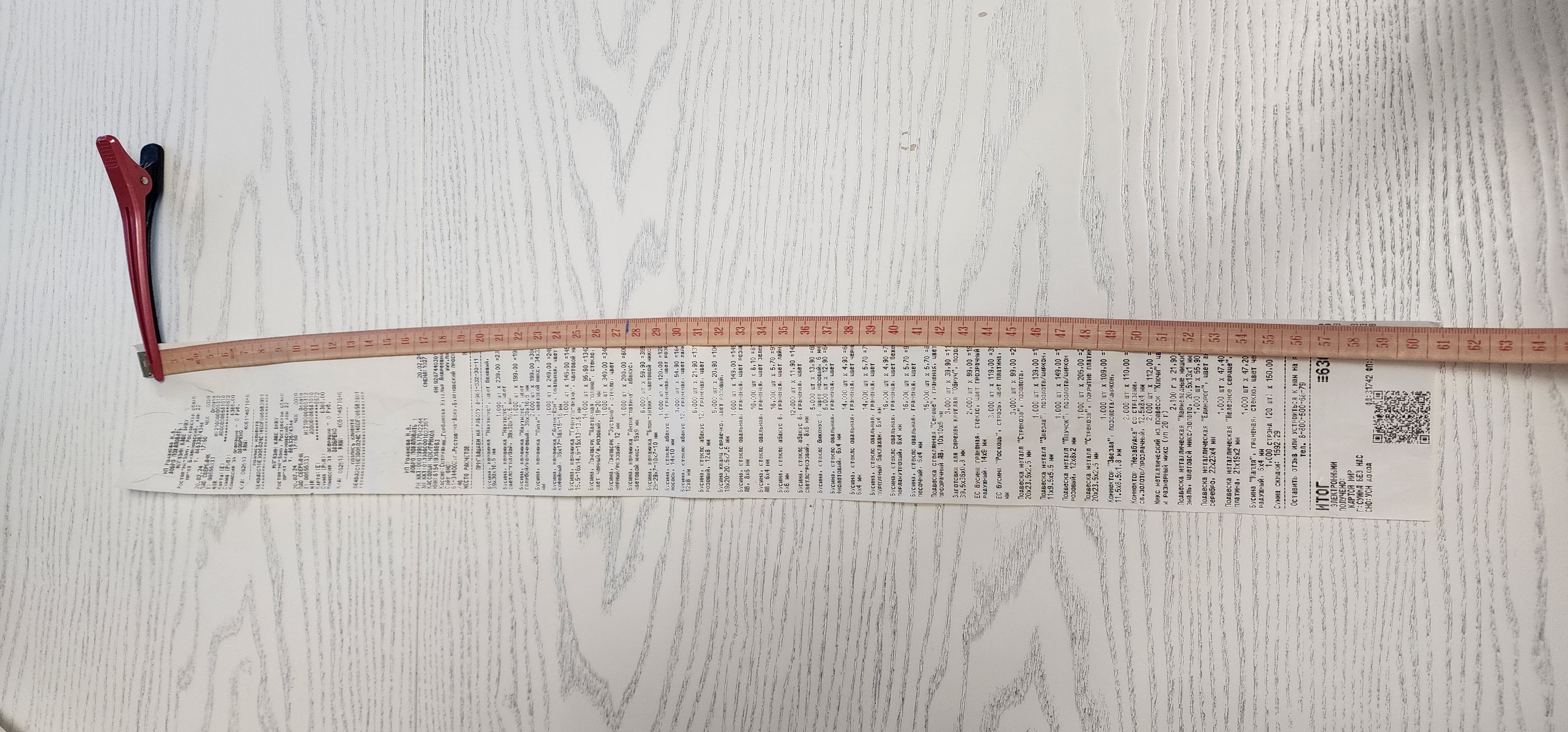 2. Измерьте длину вашего чека и сфотографируйте его рядом с линейкой или метром. Обратите внимание, что экваринговая часть чека (верхняя часть чека до обозначения ИП, печатается не всегда) и купон за покупку в конце чека не учитываются!