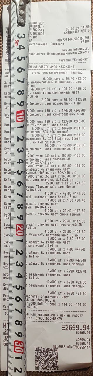 Наталья, покупка 24.02.2024. Длина чека 34 см. Магазин в г. Ростов-на- Дону, пр. Буденновский 22/46. https://vk.com/id100763745 Почта : natalya-semendyaeva@mail.ru