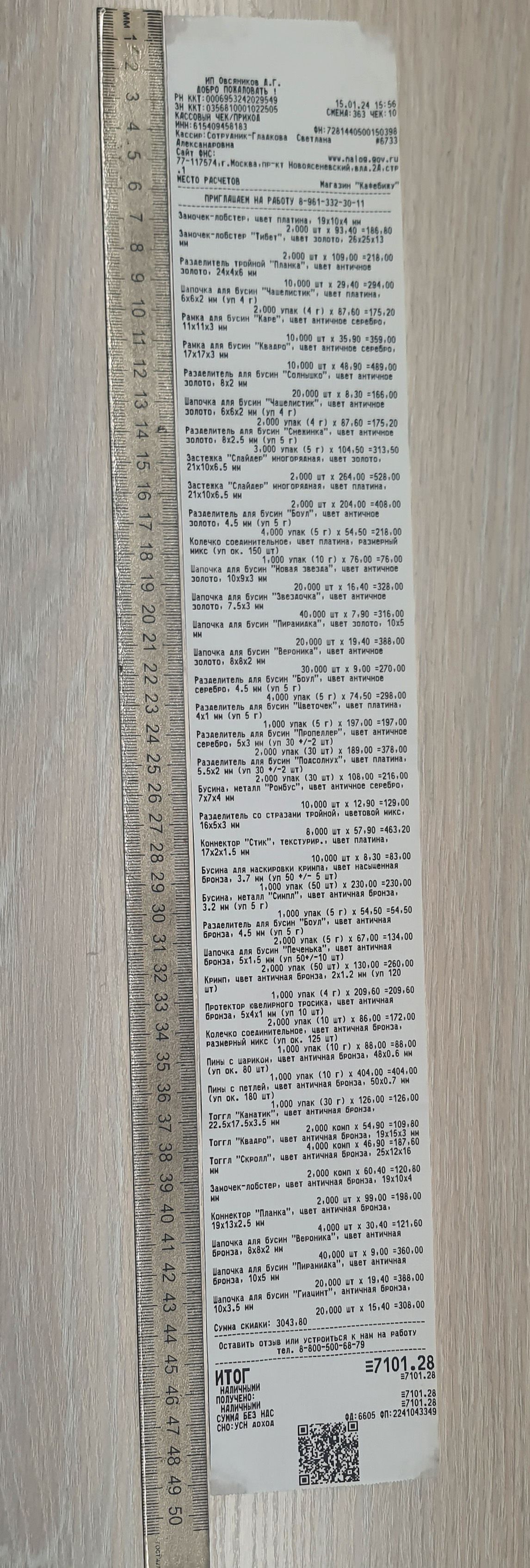 Покупка совершена 15.01.2024 в магазине по адресу Пр-т Новоясеневский влд 2а стр1. Адрес моей страницы VK https://vk.com/lsolntseva2022 Длина чека 49,5 см.